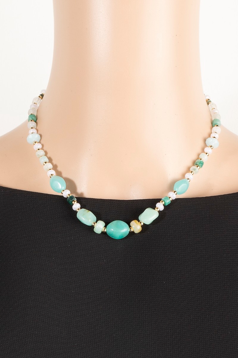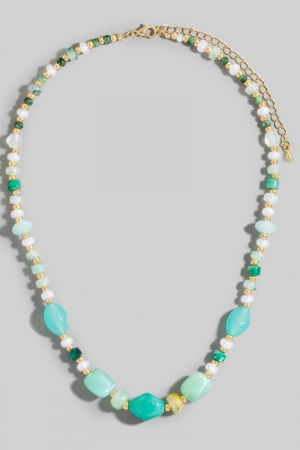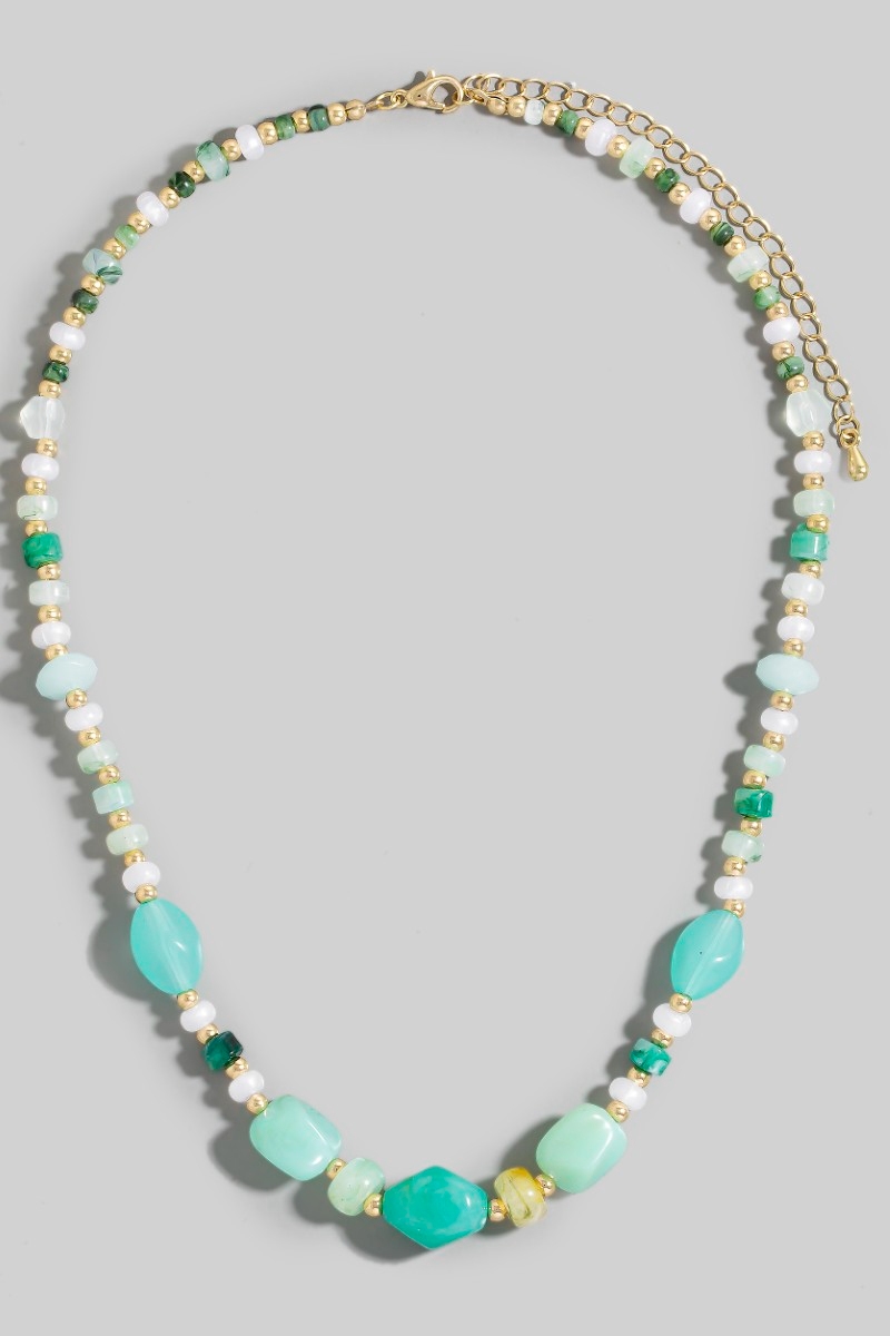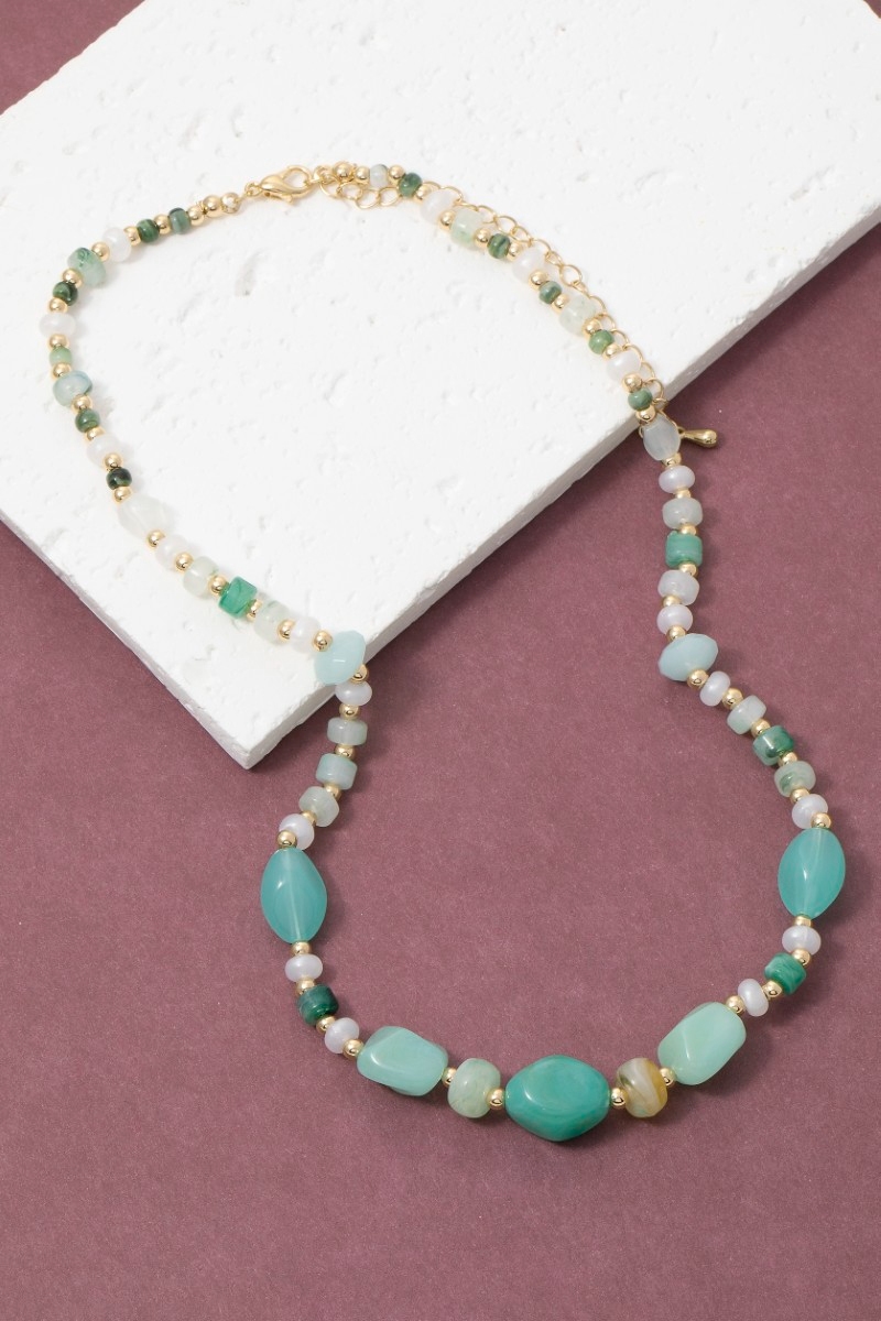 • This necklace features a fashionable mixed irregular turquoise resin beaded style. Redefine your look effortlessly with this standout, on-trend piece.