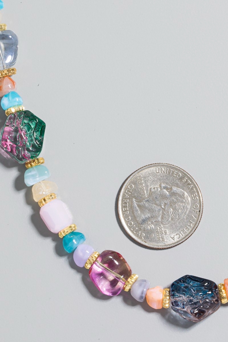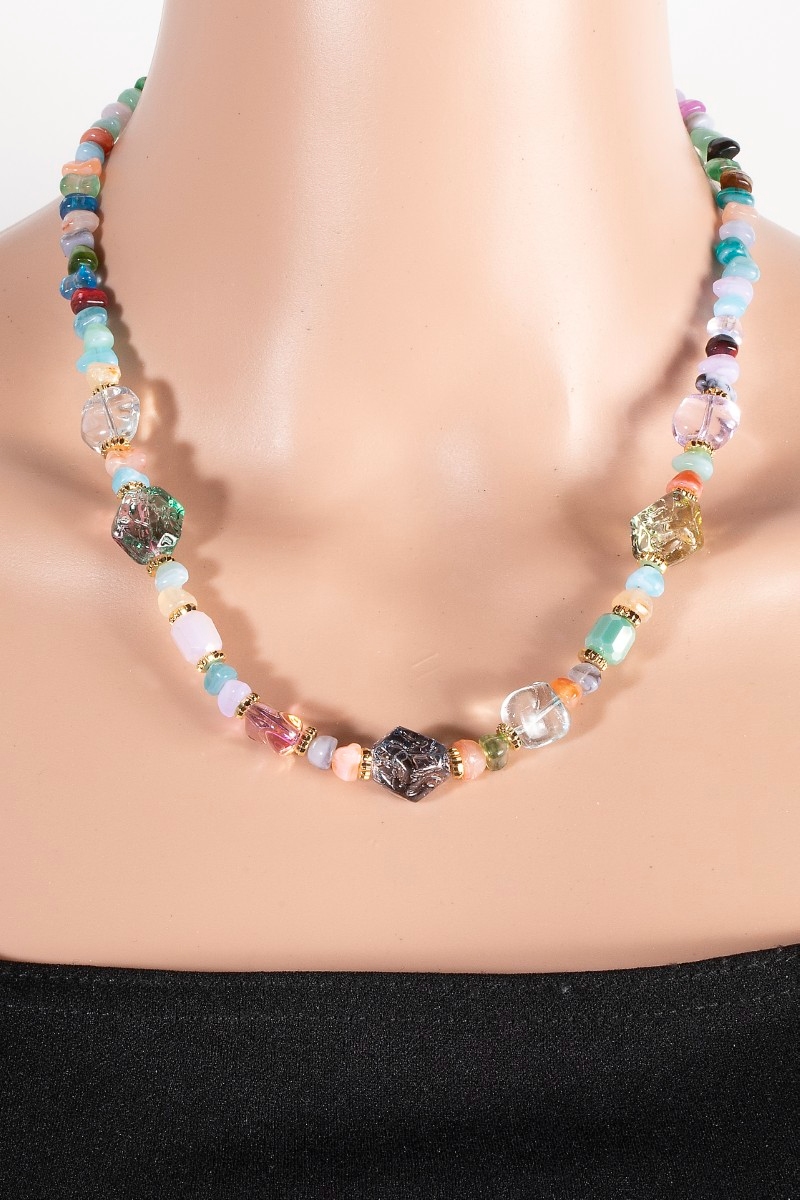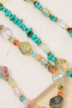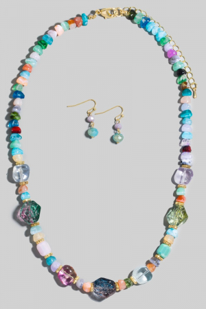 - This necklace set brings a unique assorted stone and resin beaded style. Elevate your ensemble with this necklace set that effortlessly captures the essence of refined fashion.