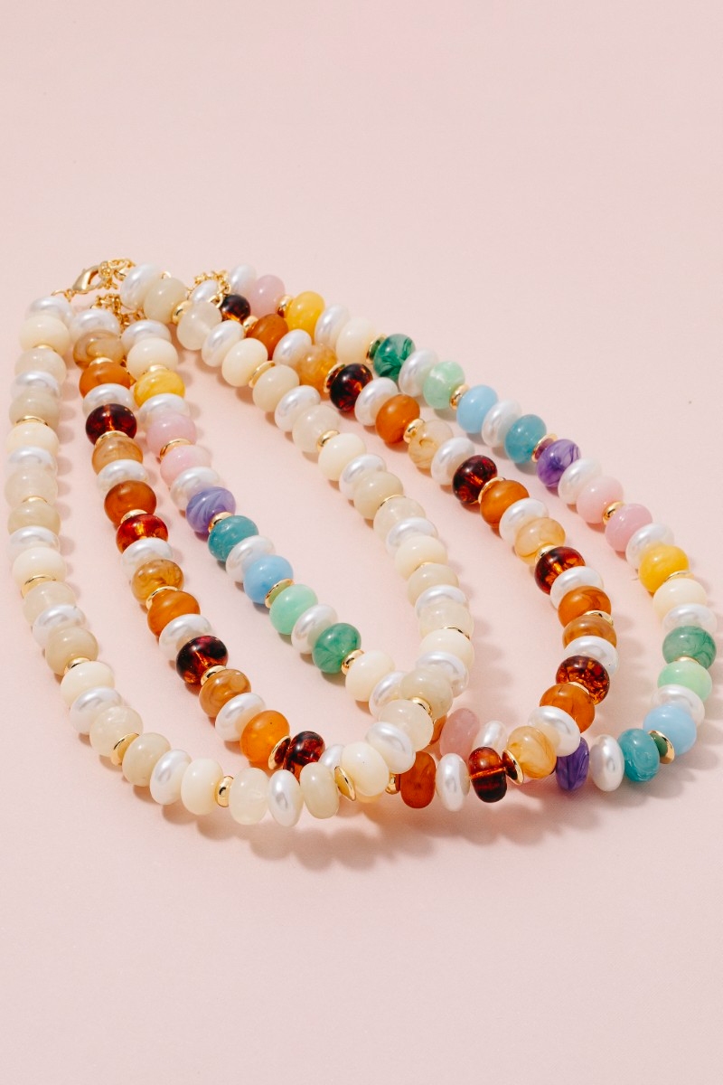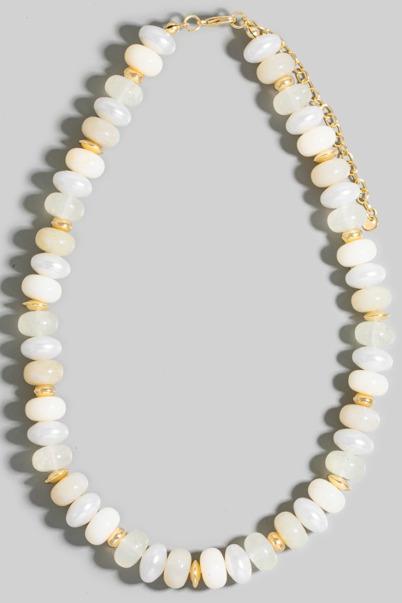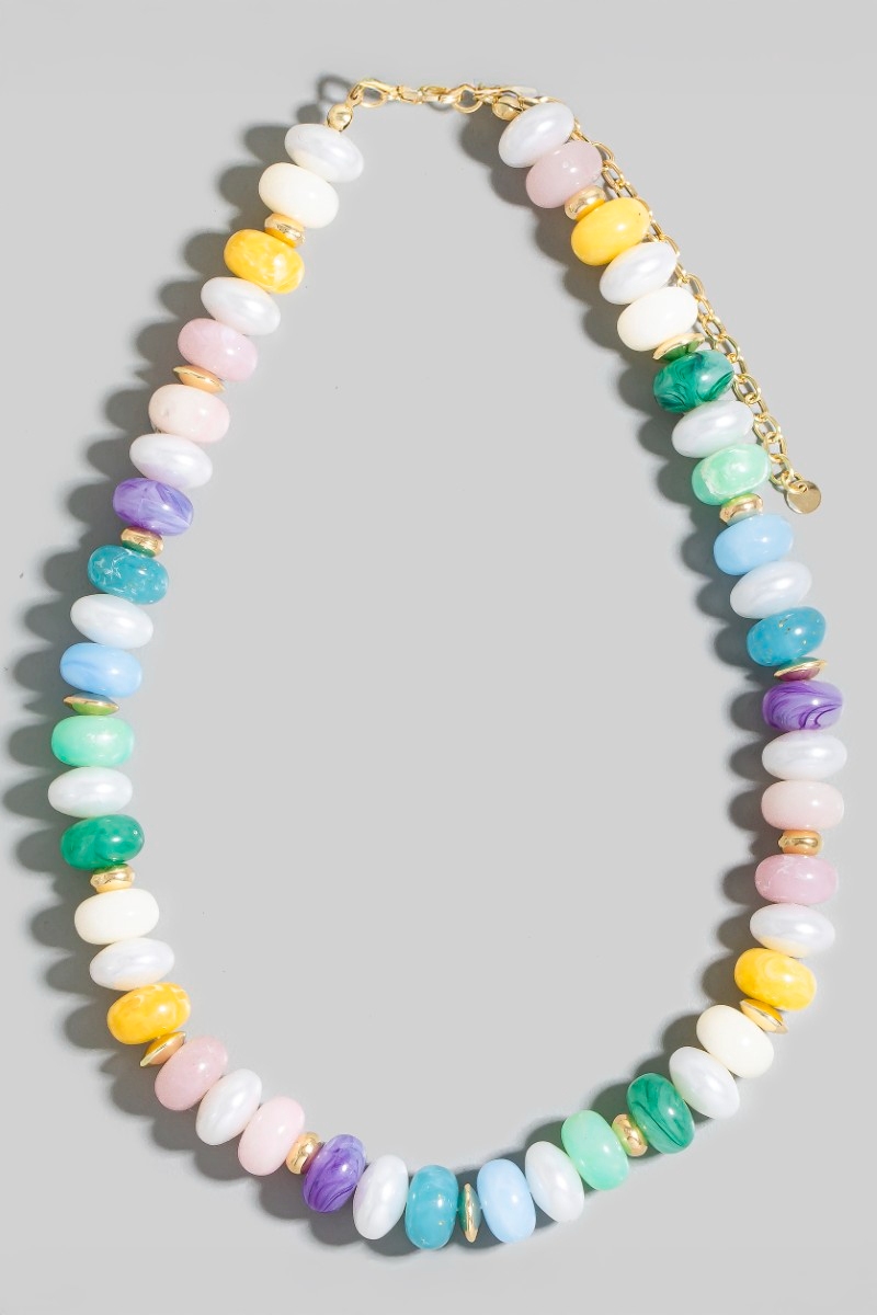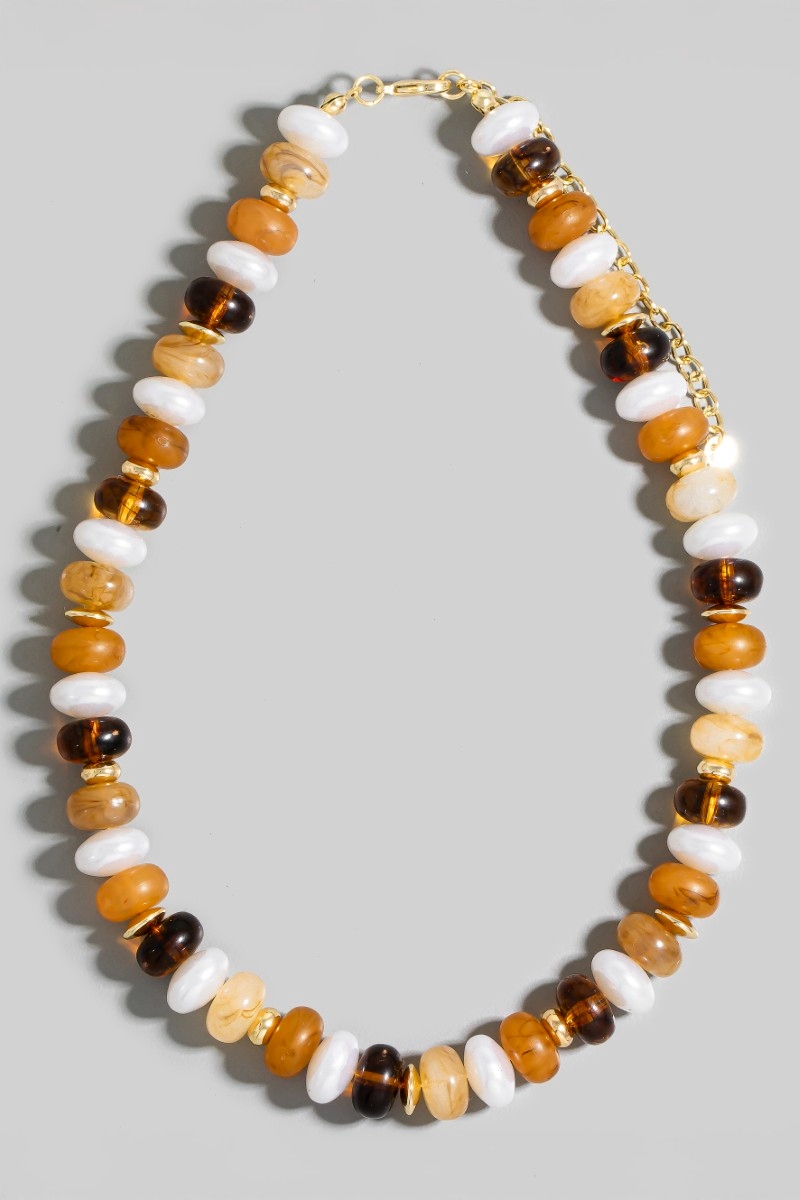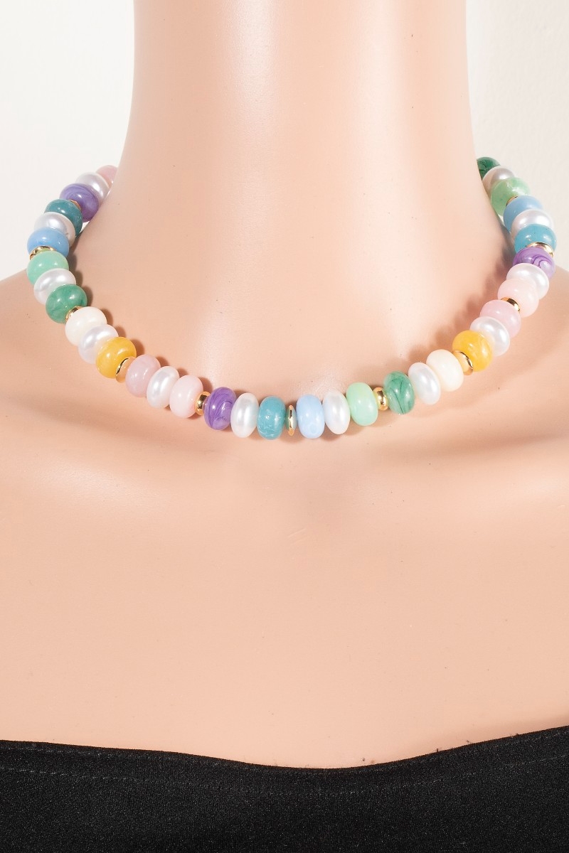 • This necklace brings a unique mixed pearl and marble resin disc beaded style. Savor the craftsmanship that goes beyond the ordinary, as this necklace effortlessly captivates attention.