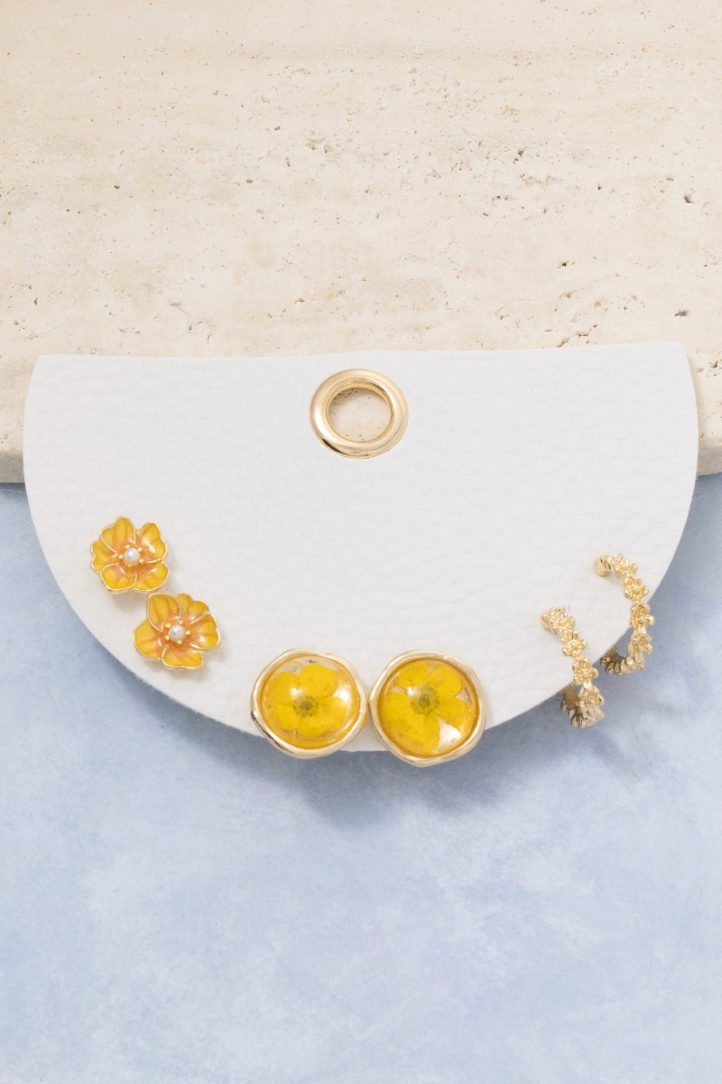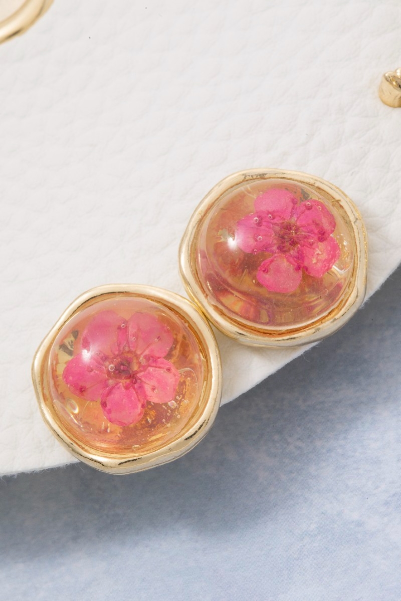 • This pair of earrings brings a unique three pair resin pressed flower set style. Indulge in the artistry of accessorizing with this unique piece.