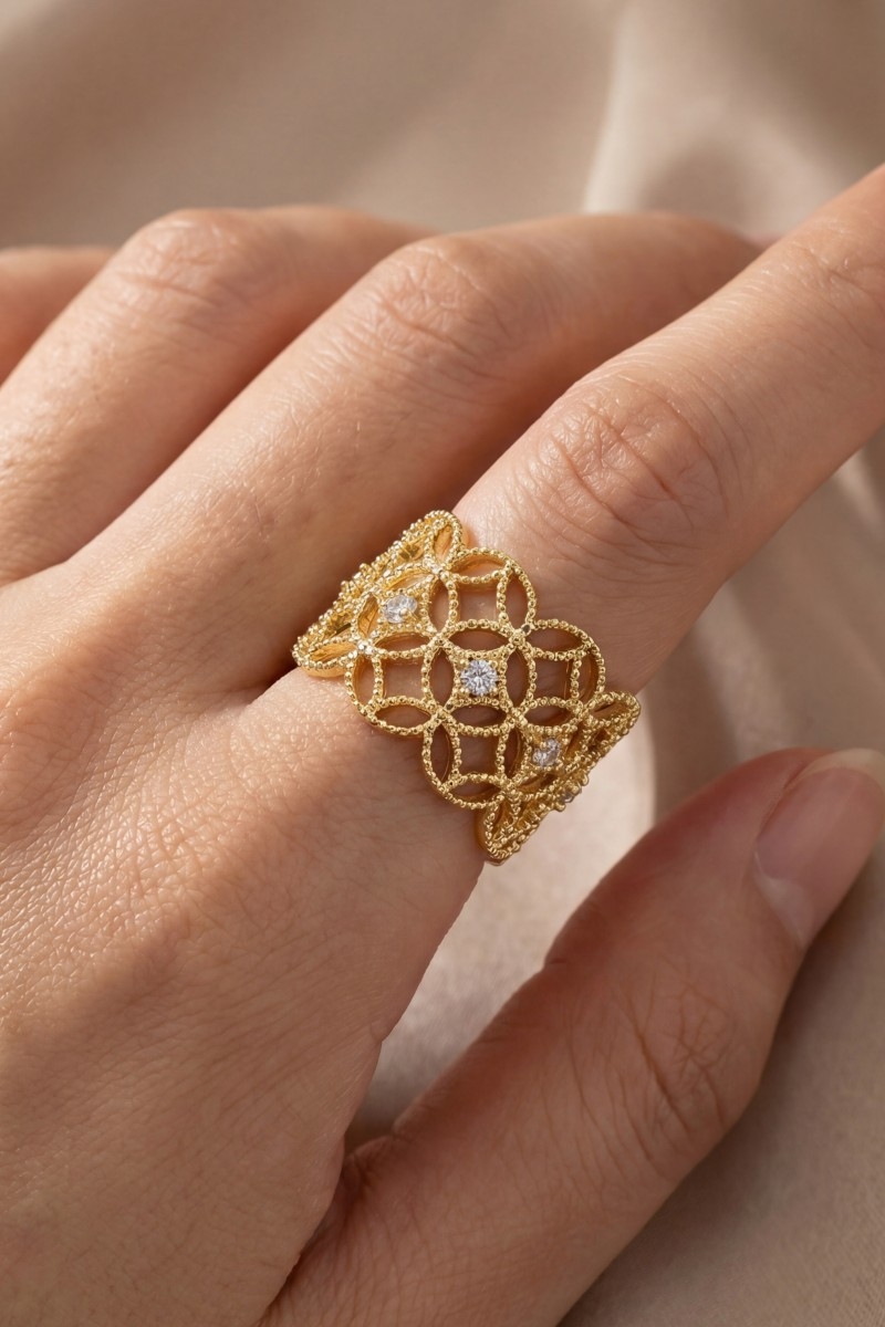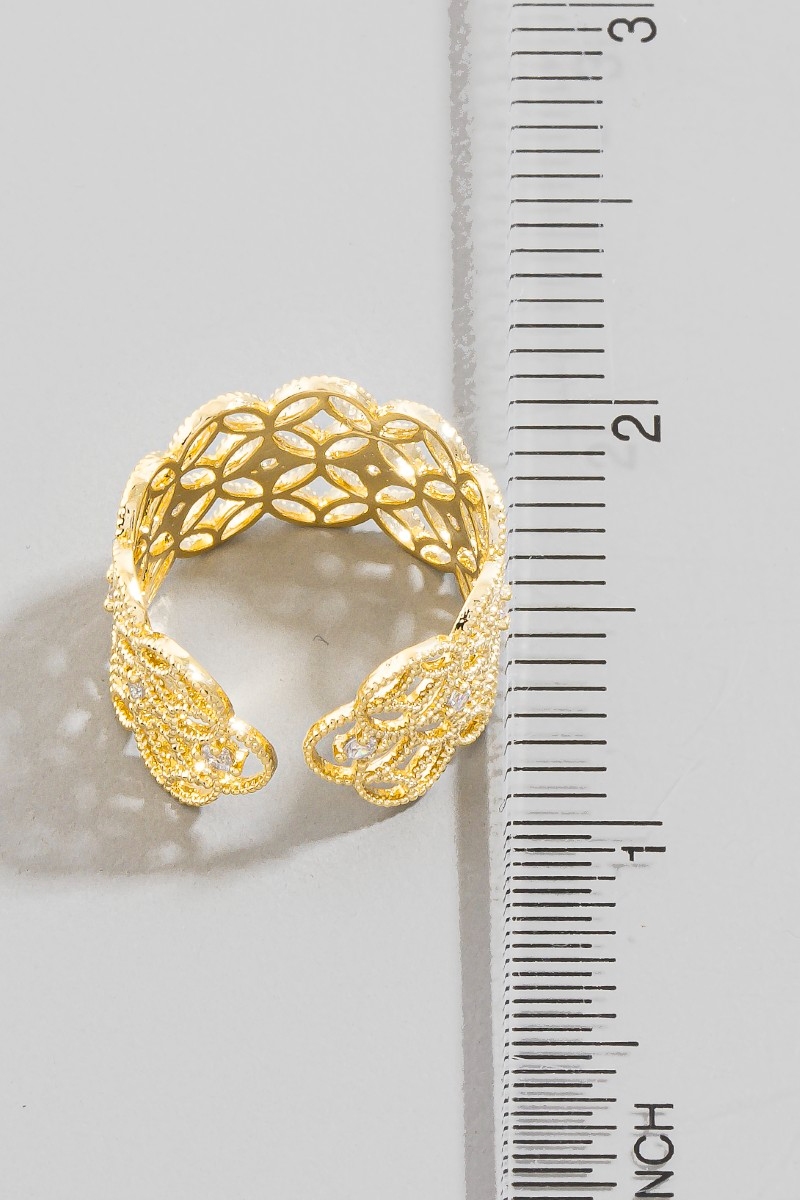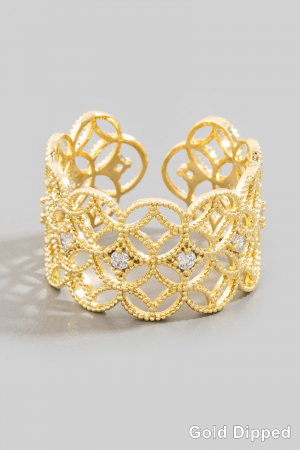 • This ring brings a luxurious gold dipped cubic zirconia filigree style. Unveil a new dimension of sophistication as this ring effortlessly enhances the elegance of your ensemble.