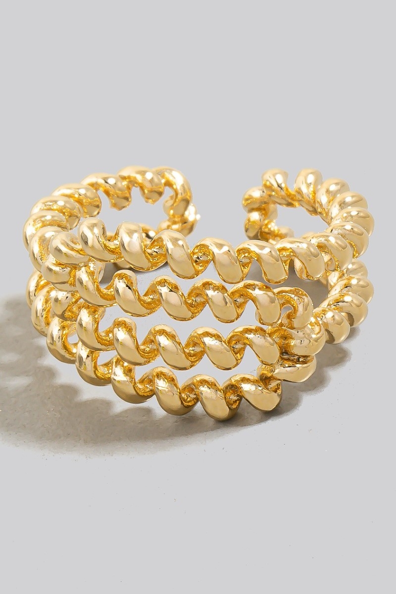 - This ring features a fashionable intricate twisted layered open band style. Unveil modern elegance with this subtly intricate ring.