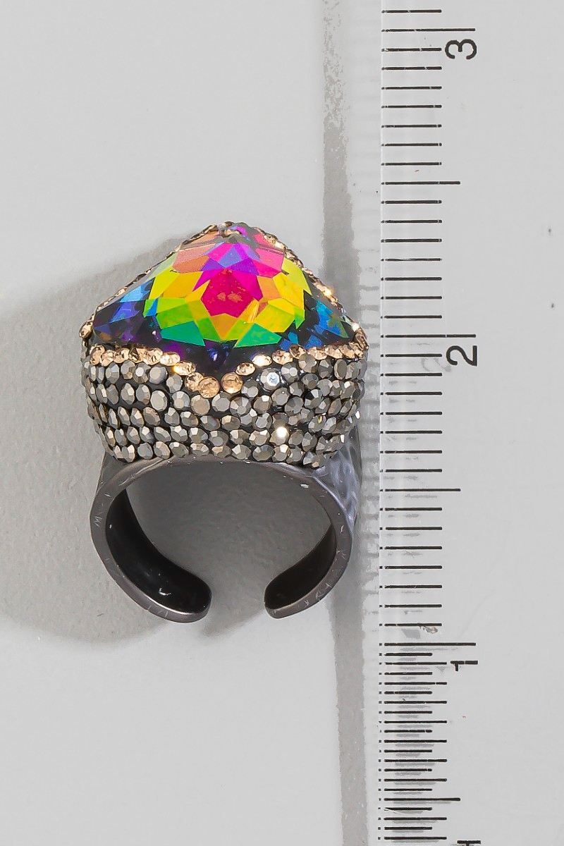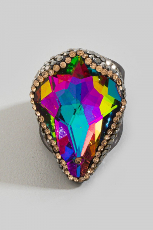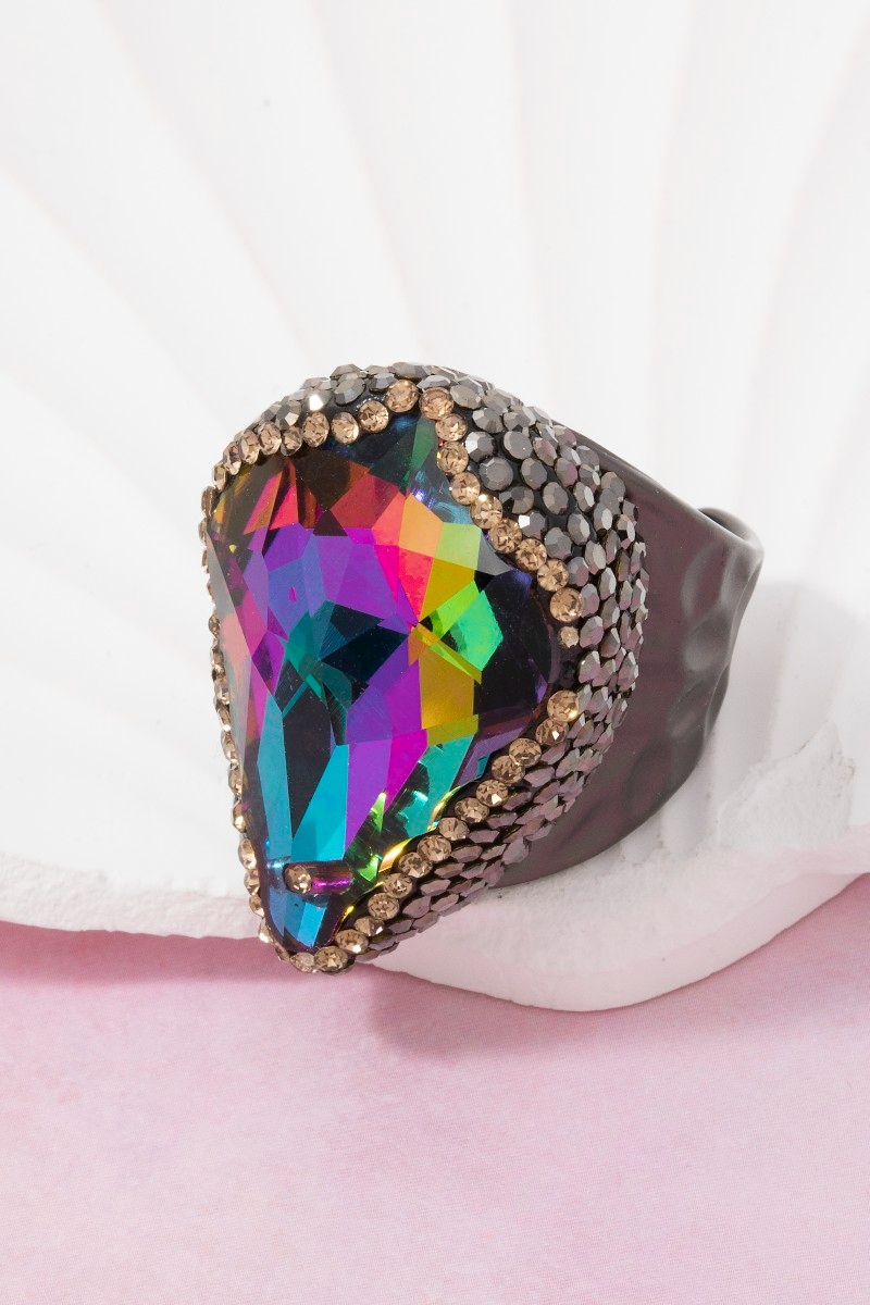 - This ring displays a fashionable iridescent glass stone statement style. Immerse yourself in the details of design, as this ring effortlessly becomes a conversation starter.