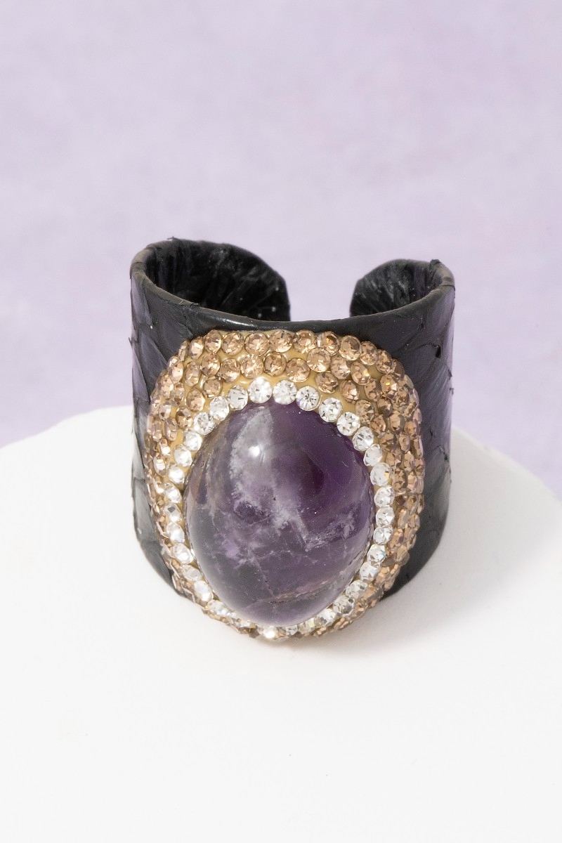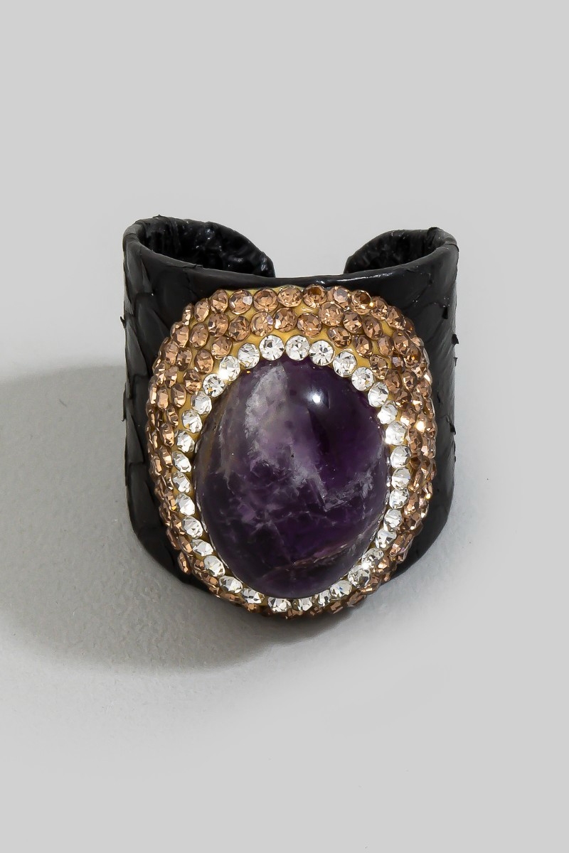 - This ring brings a stunning pave amethyst stone with leather band statement style. Savor the allure of detailed craftsmanship in this exquisite ring.
