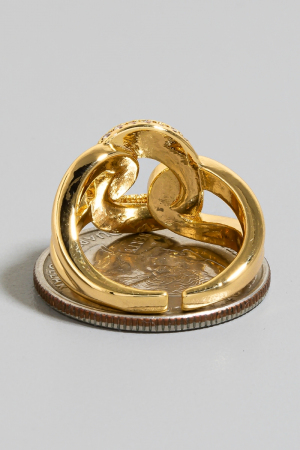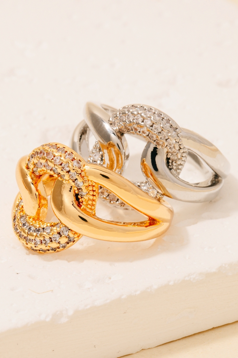 - This ring brings a unique pave hoop knot open band style. Unveil modern elegance with this subtly intricate ring.