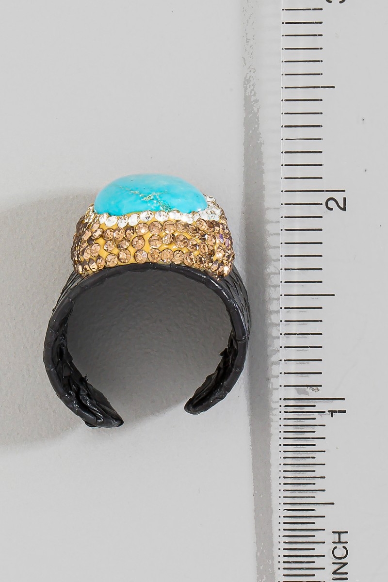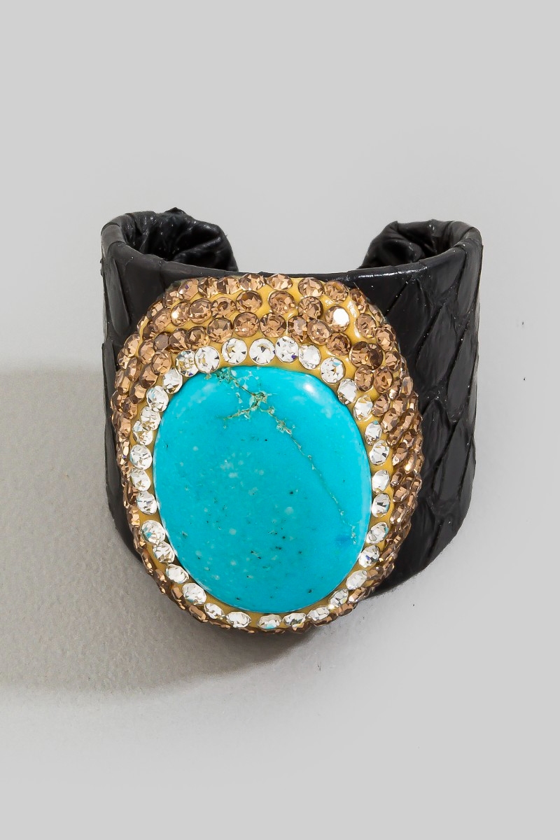 - This ring adds a modern pave turquoise stone with leather band statement style. Embark on a journey of sartorial refinement as this ring effortlessly complements your fashion sense.
