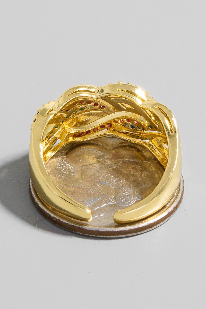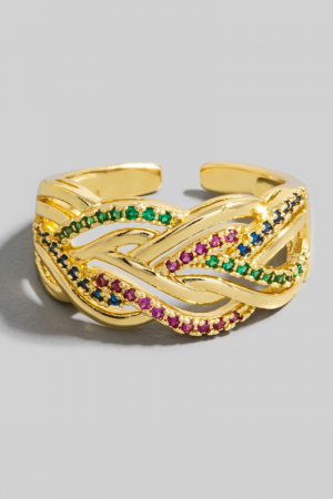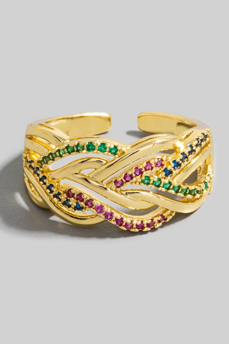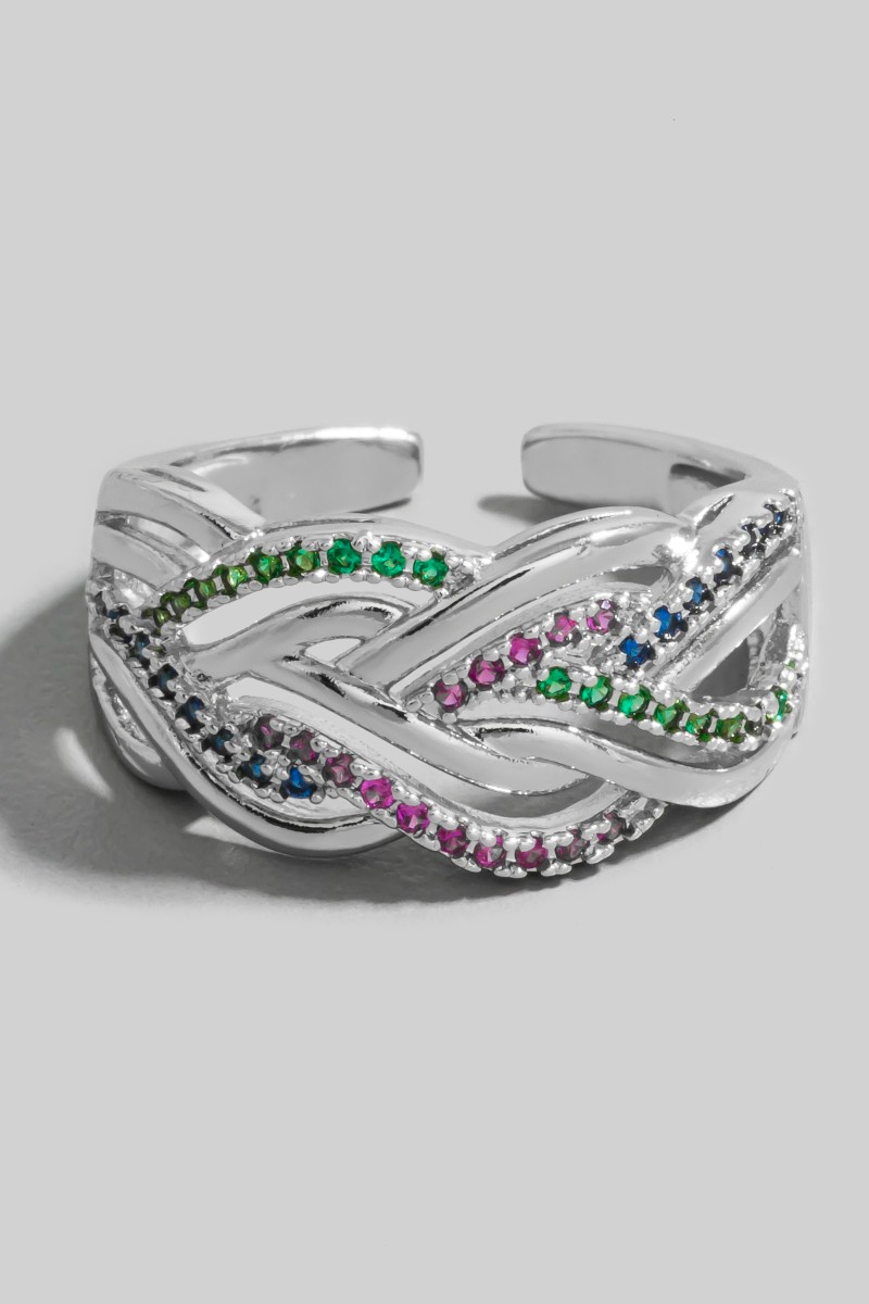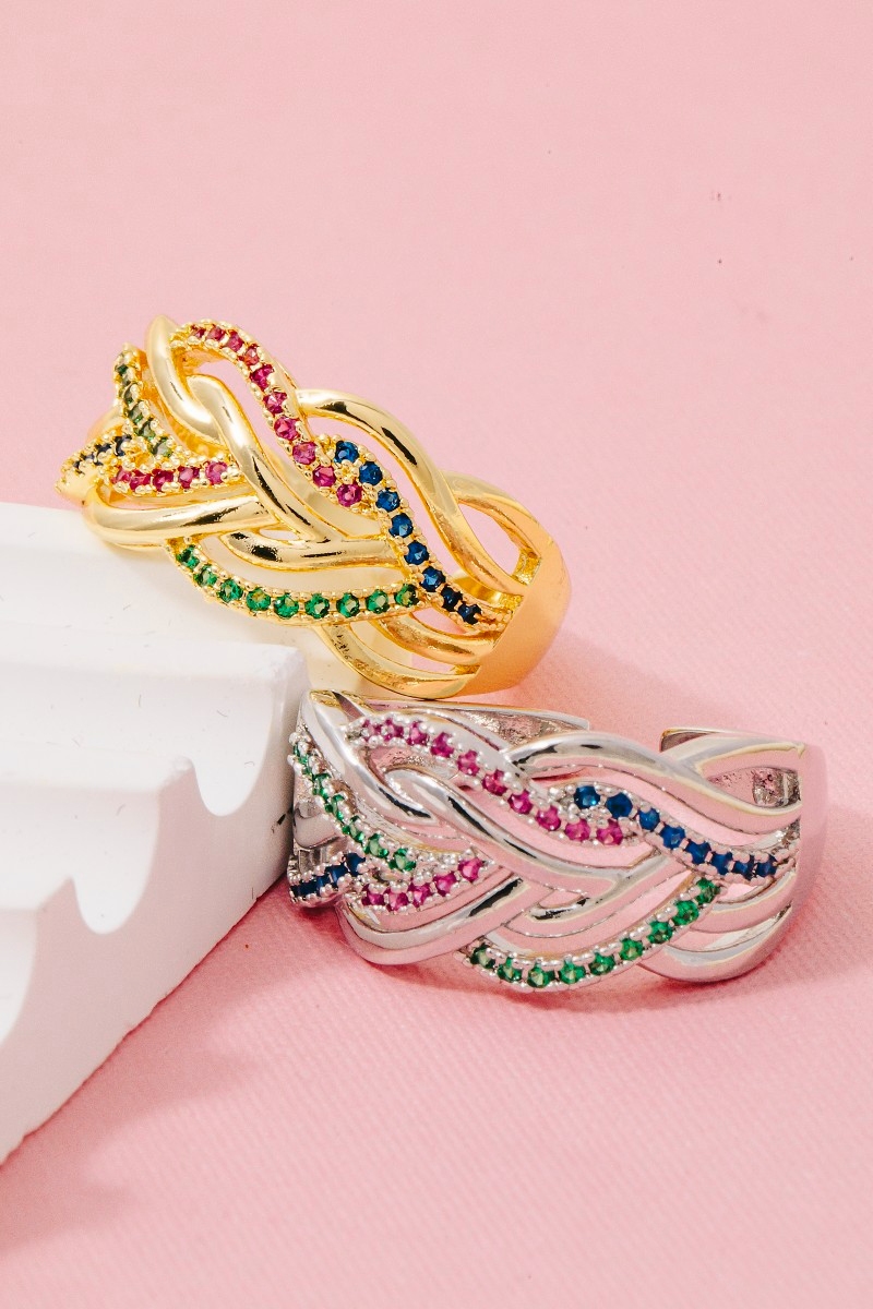 - This ring displays a fashionable rhinestone braided band style. Immerse yourself in the details of design, as this ring effortlessly becomes a conversation starter.