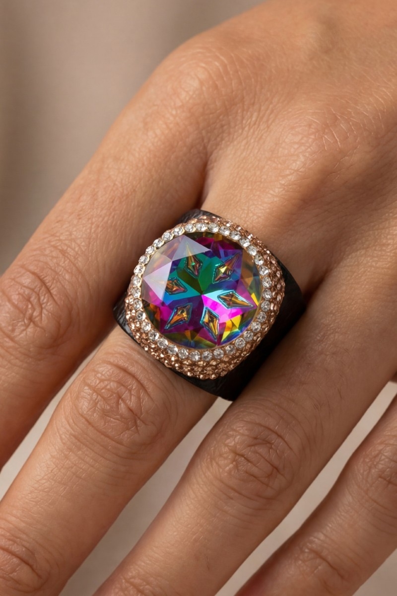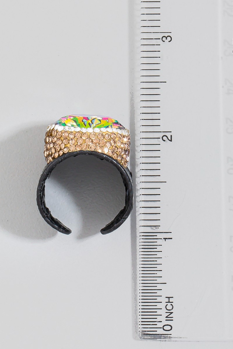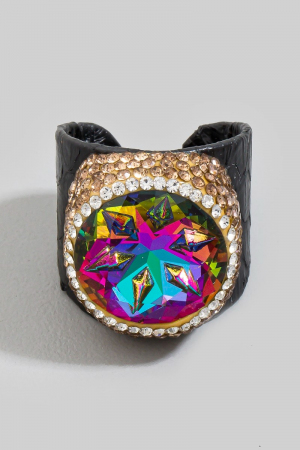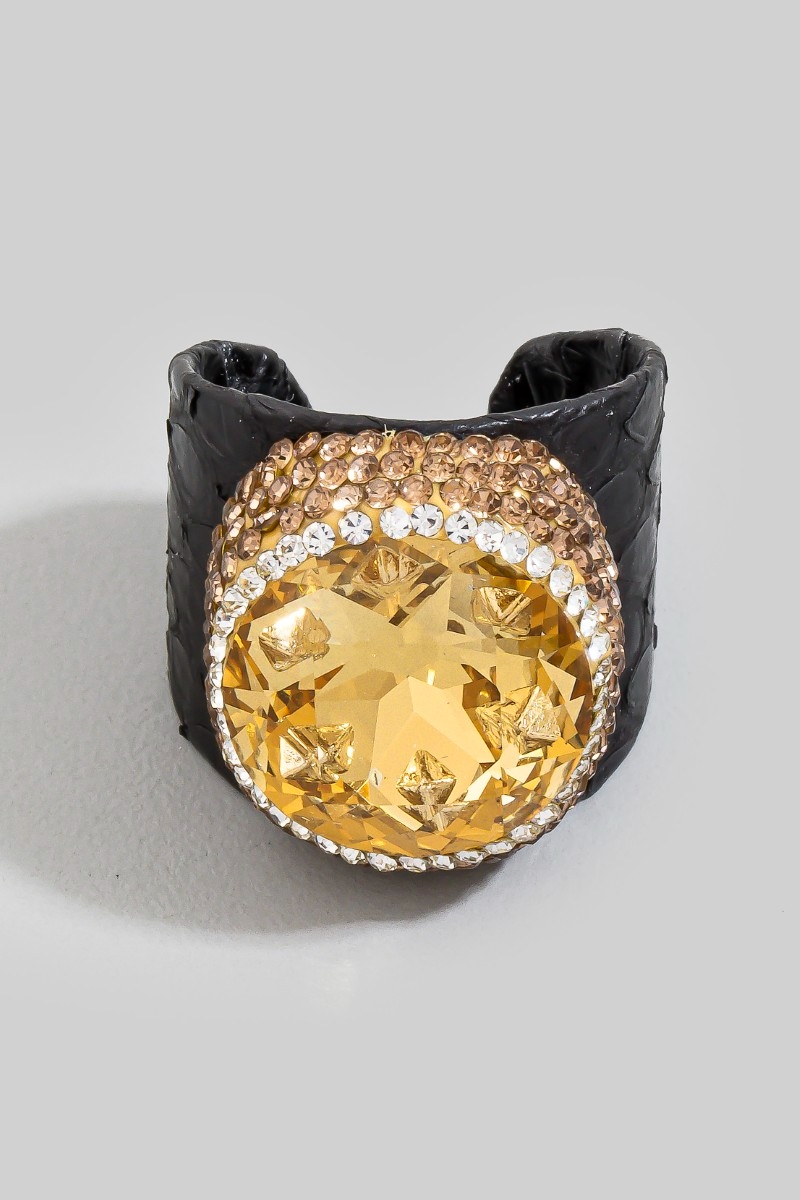 - This ring showcases a unique round faceted crystal stone leather band statement style. Embark on a journey of sartorial refinement as this ring effortlessly complements your fashion sense.