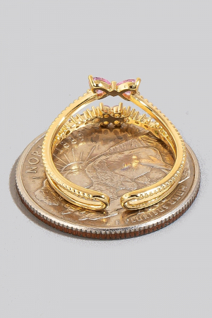 • This ring showcases a unique cz ribbon bow and flower layered open band style. Immerse yourself in the details of design, as this ring effortlessly becomes a conversation starter.