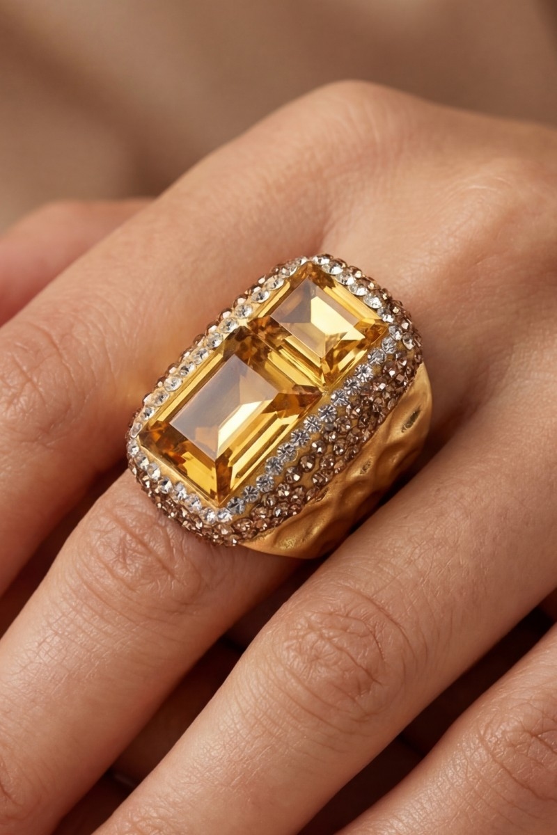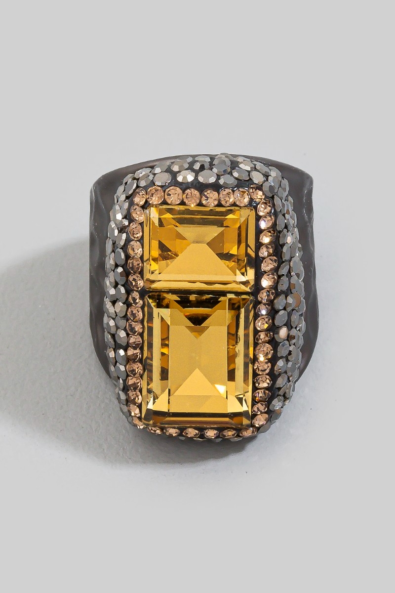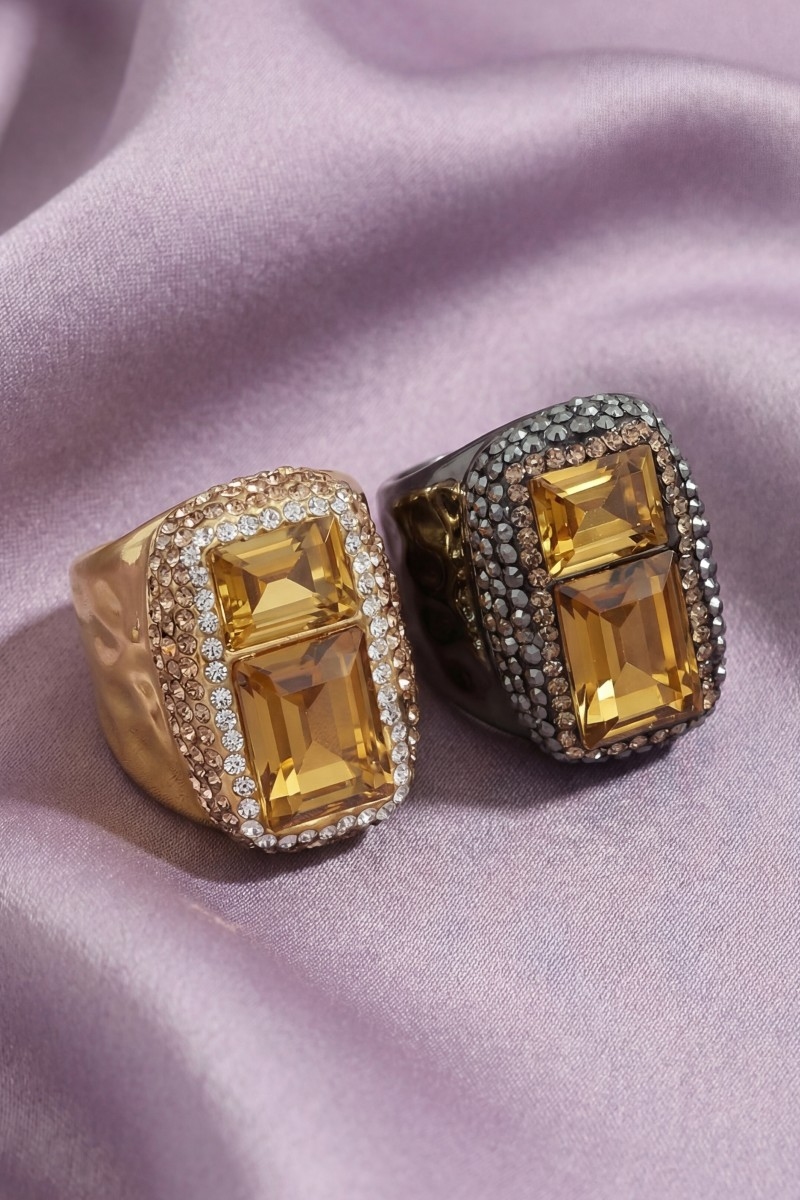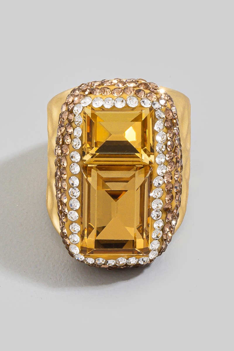 - This ring showcases a timeless double crystal pave statement style. Celebrate the art of accessorizing with this piece that effortlessly encapsulates modern trends.