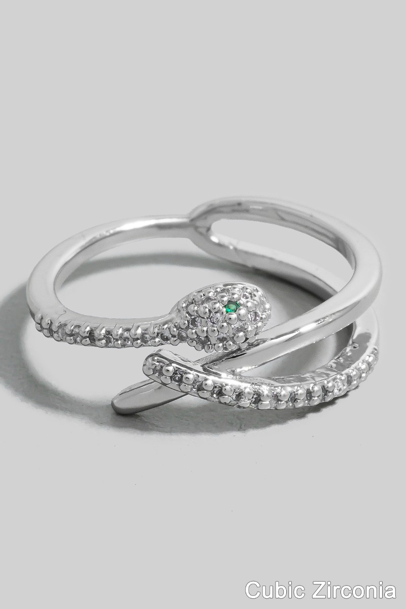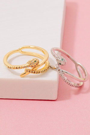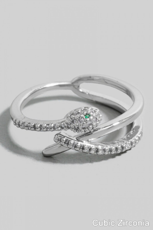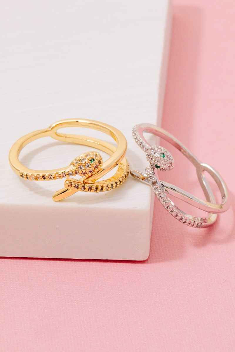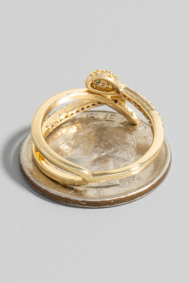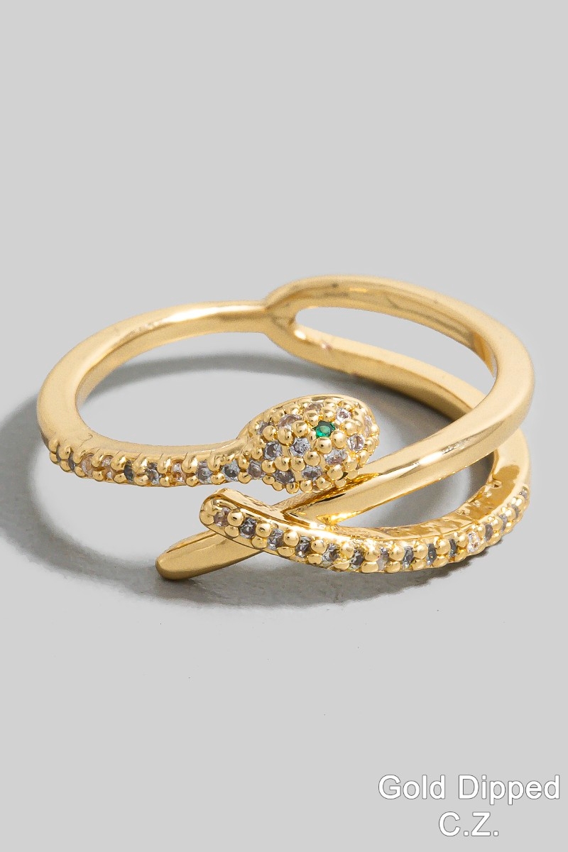 • This ring showcases a timeless gold dipped cubic zirconia layered snake open band style. Savor the allure of detailed craftsmanship in this exquisite ring.