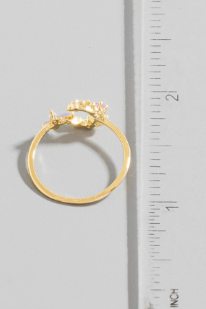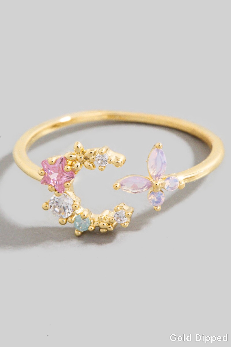 - This ring features a fashionable gold dipped cubic zirconia moon star and butterfly style. Immerse yourself in the world of understated glamour as this ring effortlessly exudes timeless appeal.