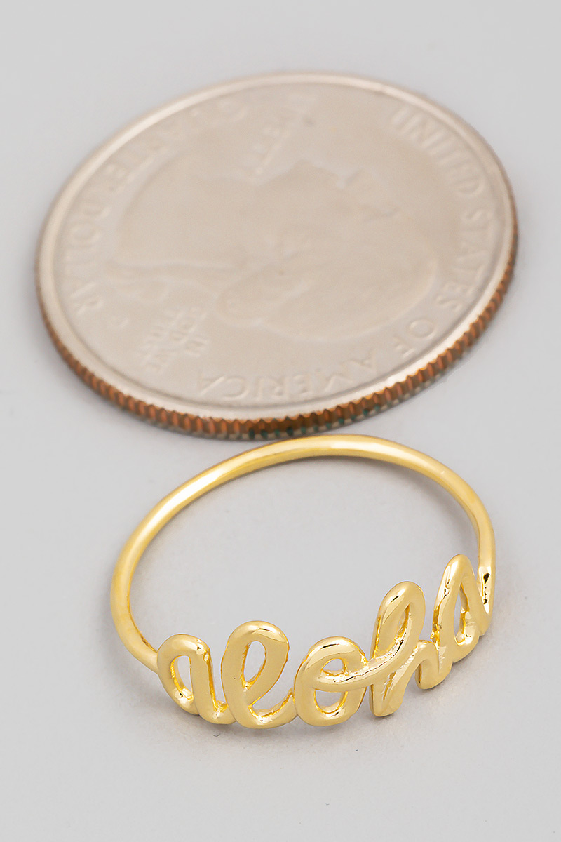 - This ring displays a fashionable gold dipped delicate handwritten aloha style. Indulge in the allure of exquisite craftsmanship as this ring effortlessly adds a touch of luxury to your attire.