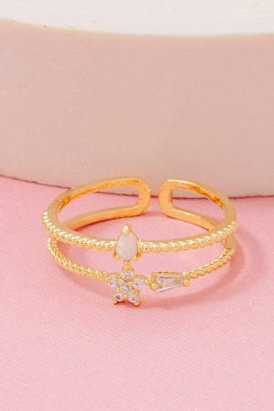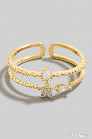 • This ring brings a stunning double row gold dipped cubic zirconia flower opal style. Experience a burst of creativity in accessorizing as this piece effortlessly sets the tone for your unique style.