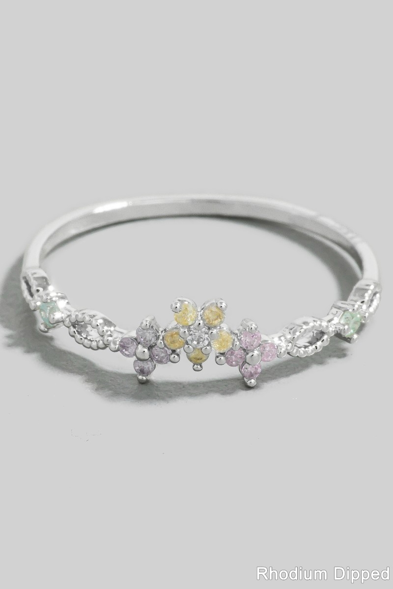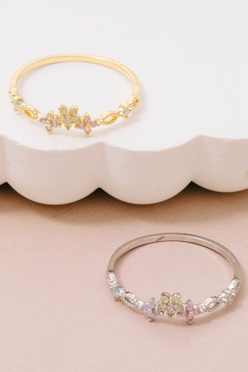 • This ring showcases a unique gold dipped colorful cubic zirconia flower style. Savor the allure of detailed craftsmanship in this exquisite ring.