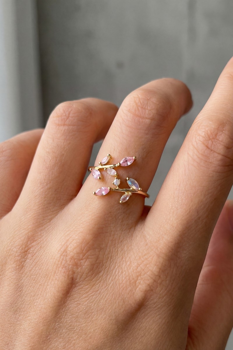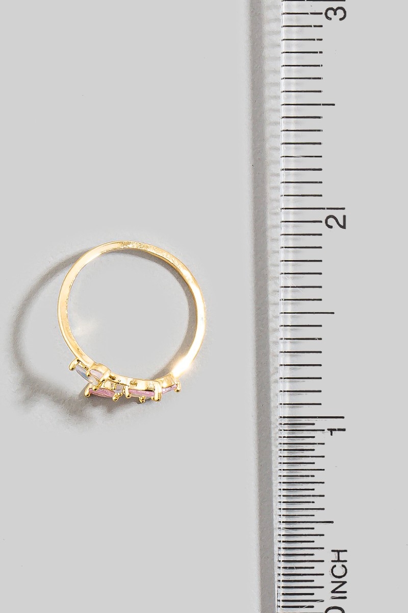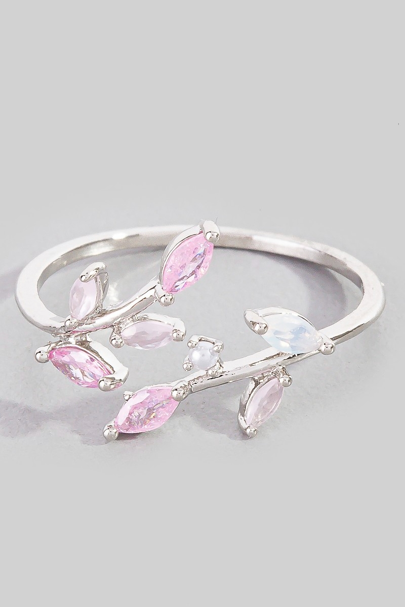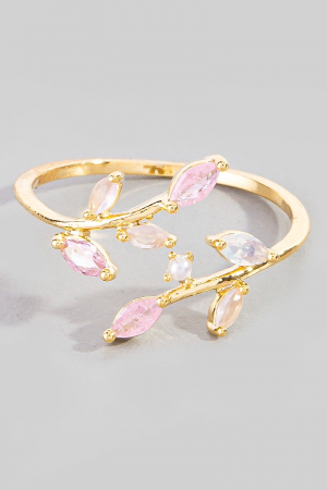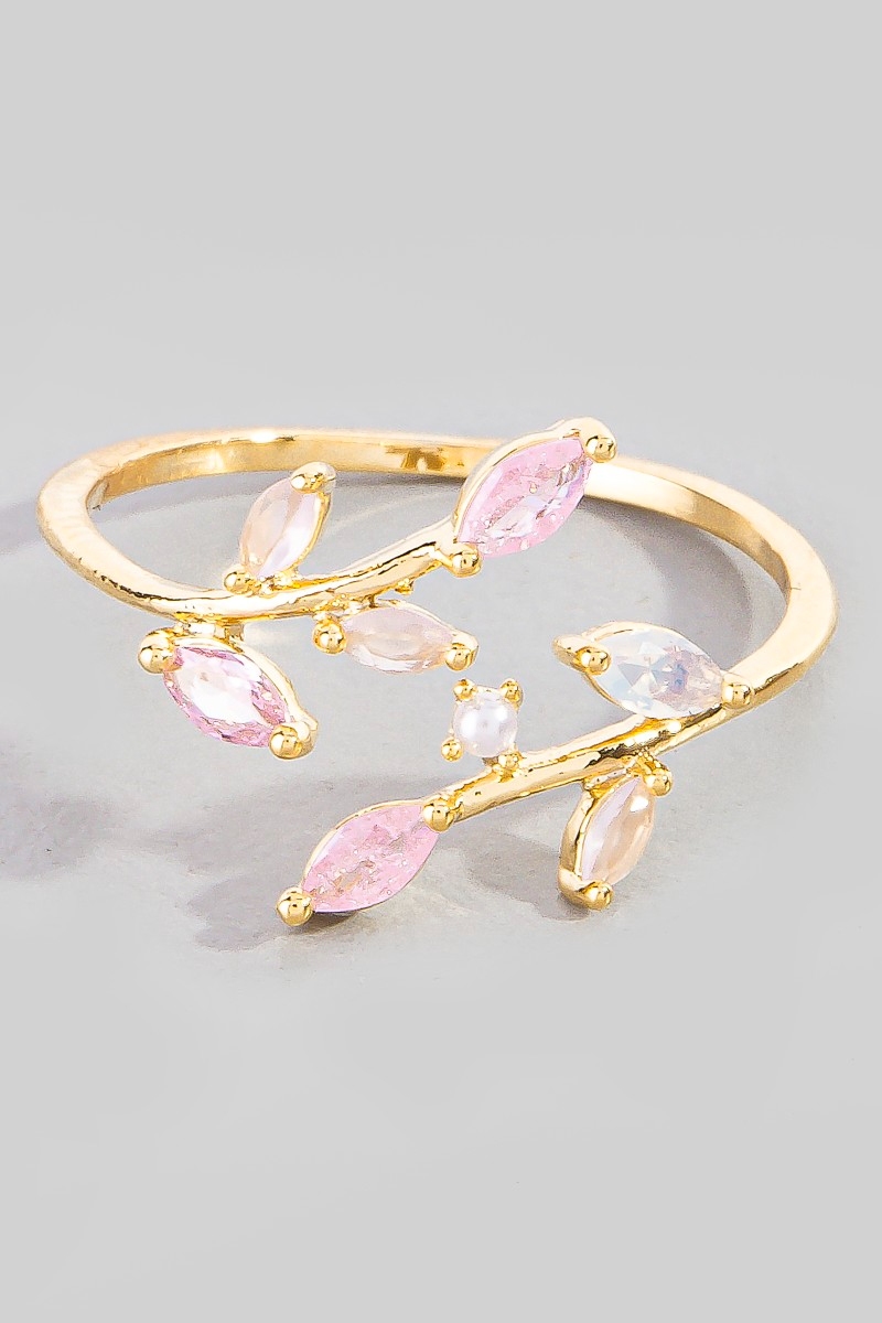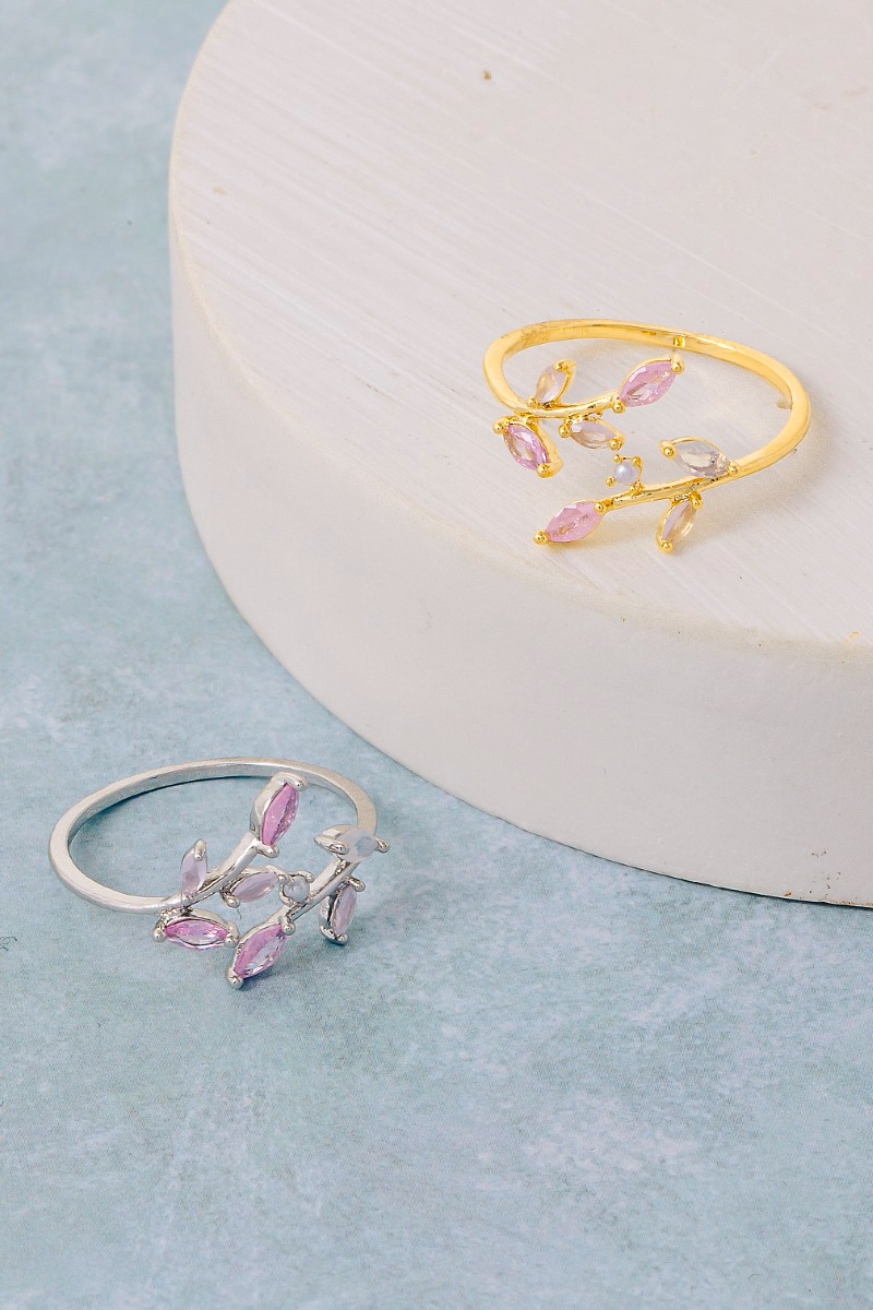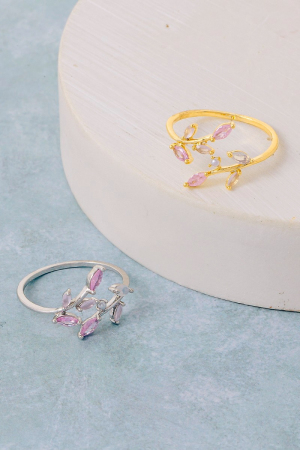 • This ring adds a modern gold dipped mixed cubic zirconia leaves open band style. Immerse yourself in the world of understated glamour as this ring effortlessly exudes timeless appeal.