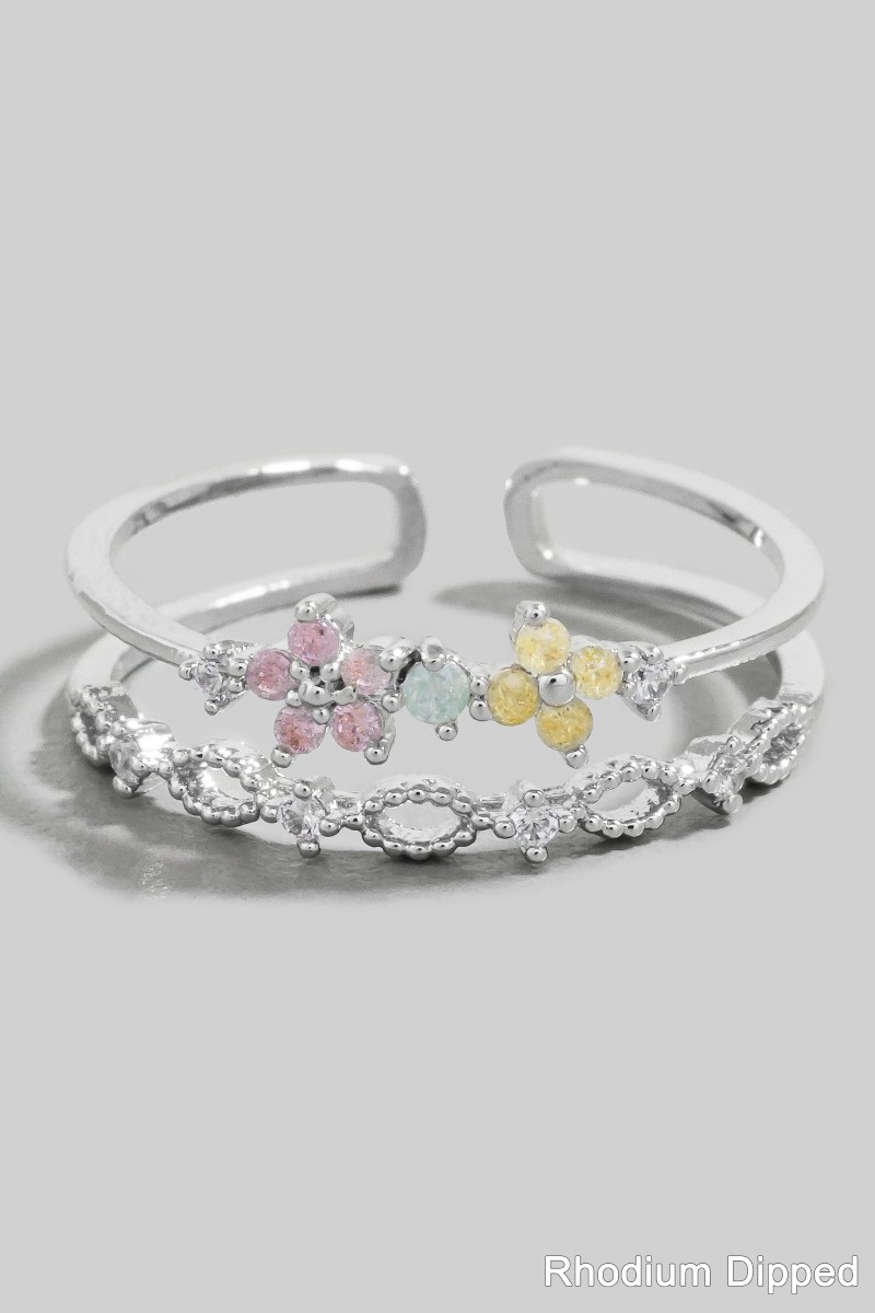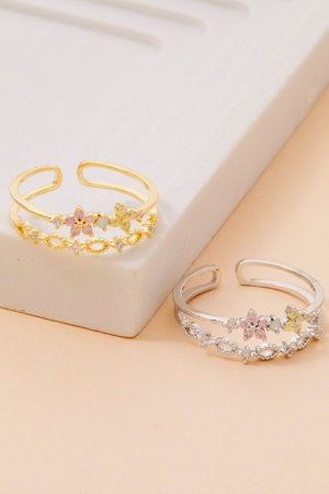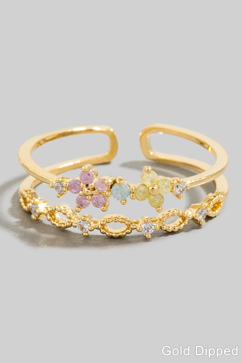 • This ring brings a luxurious two row cubic zirconia flower gold dipped style. Witness the perfect fusion of style and functionality as this ring effortlessly complements your lifestyle.