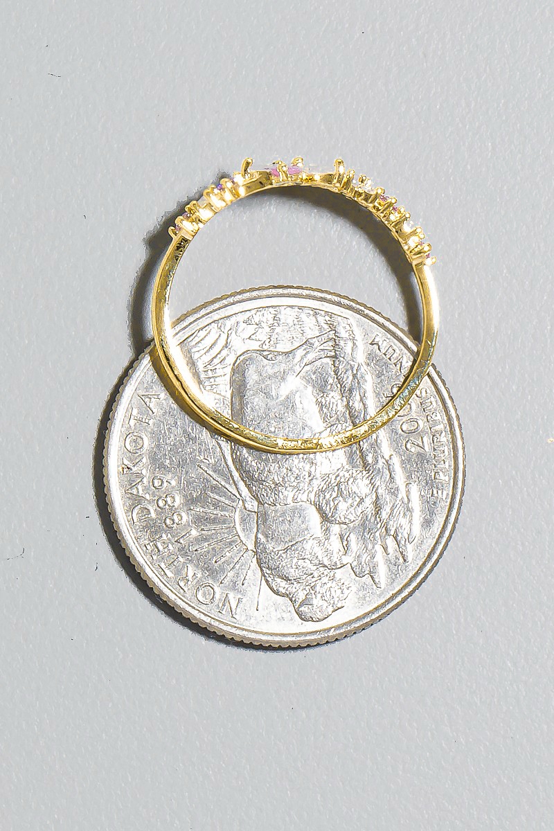 - This ring displays a fashionable gold dipped vibrant cubic zirconia flower band style. Unveil a new dimension of sophistication as this ring effortlessly enhances the elegance of your ensemble.