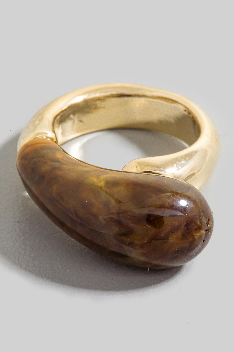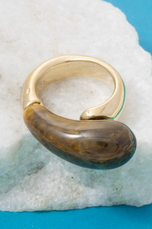 - This ring showcases a unique acrylic tear accent metallic band style. Indulge in the allure of exquisite craftsmanship as this ring effortlessly adds a touch of luxury to your attire.