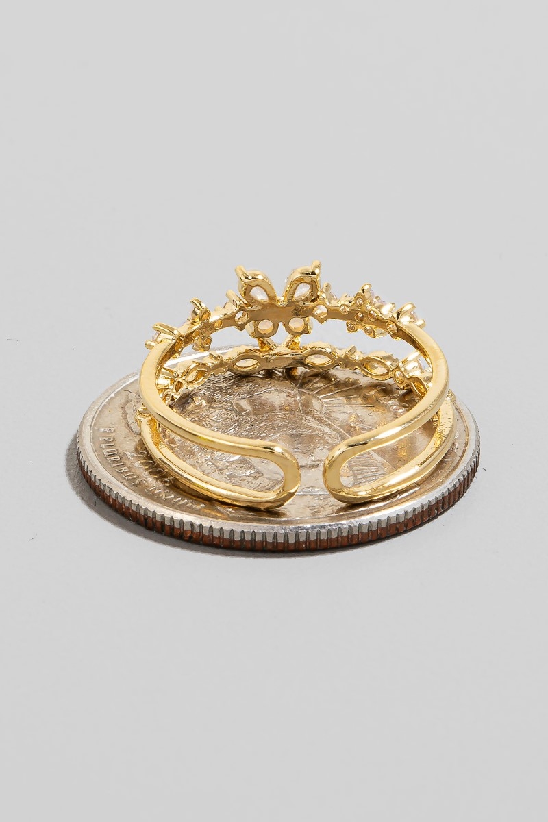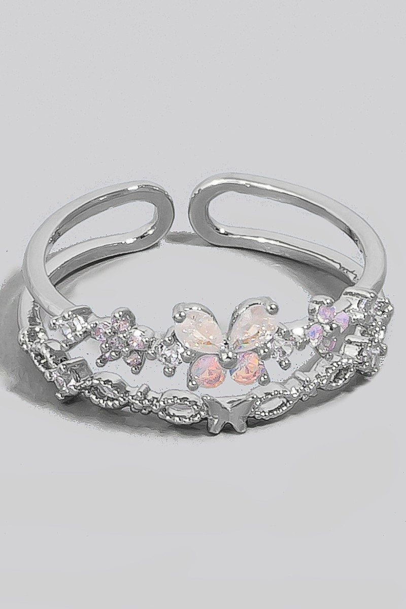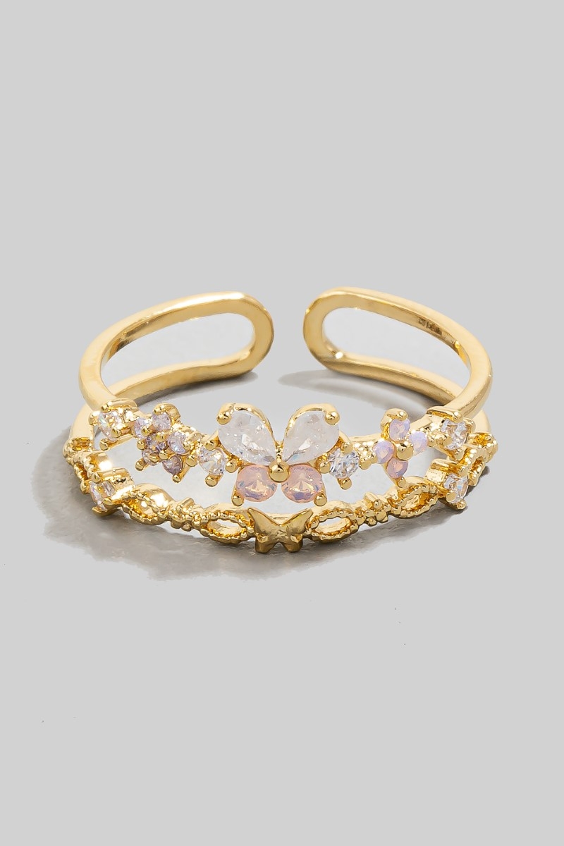 • This ring adds a modern cz butterflies and flowers layered open band style. Unveil a new dimension of sophistication as this ring effortlessly enhances the elegance of your ensemble.