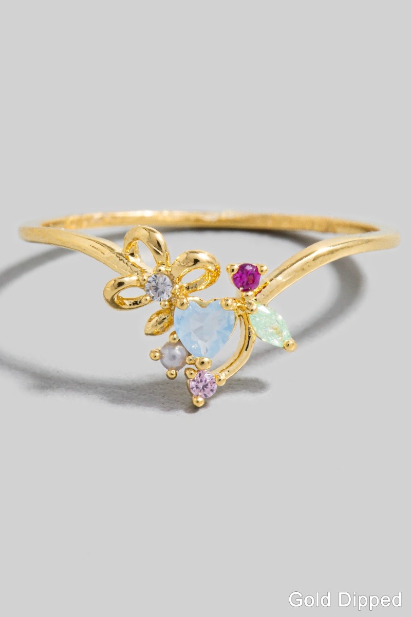 • This ring introduces a unique gold dipped cubic zirconia floral style. Witness the transformative power of accessories as this piece effortlessly redefines your fashion narrative.