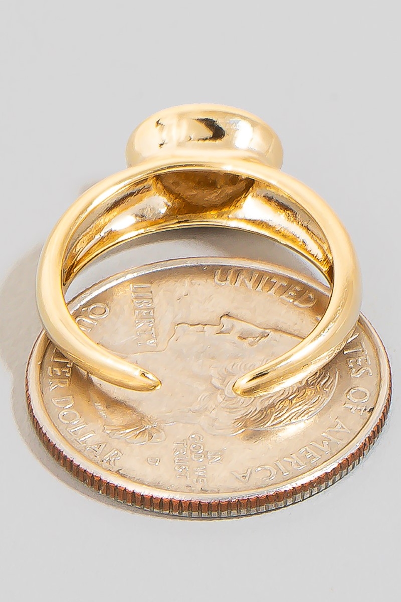 • This ring displays a vibrant gold dipped metallic false gem open band style. Celebrate individuality with this ring that effortlessly expresses your unique sense of style.