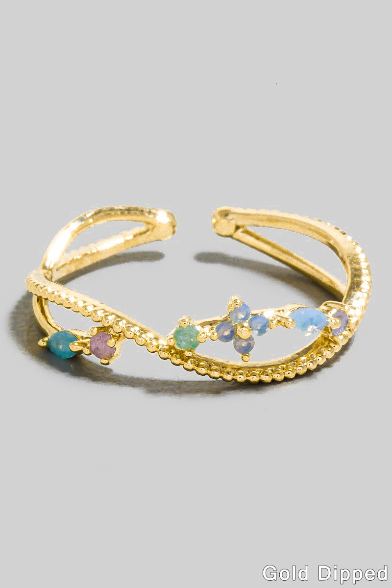 • This ring brings a unique gold dipped mixed cubic zirconia flower open band style. Unveil a new dimension of sophistication as this ring effortlessly enhances the elegance of your ensemble.