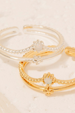 • This ring brings a unique gold dipped opal and flower layered open band style. Step into a world of refined taste as this ring effortlessly refines the details of your outfit.