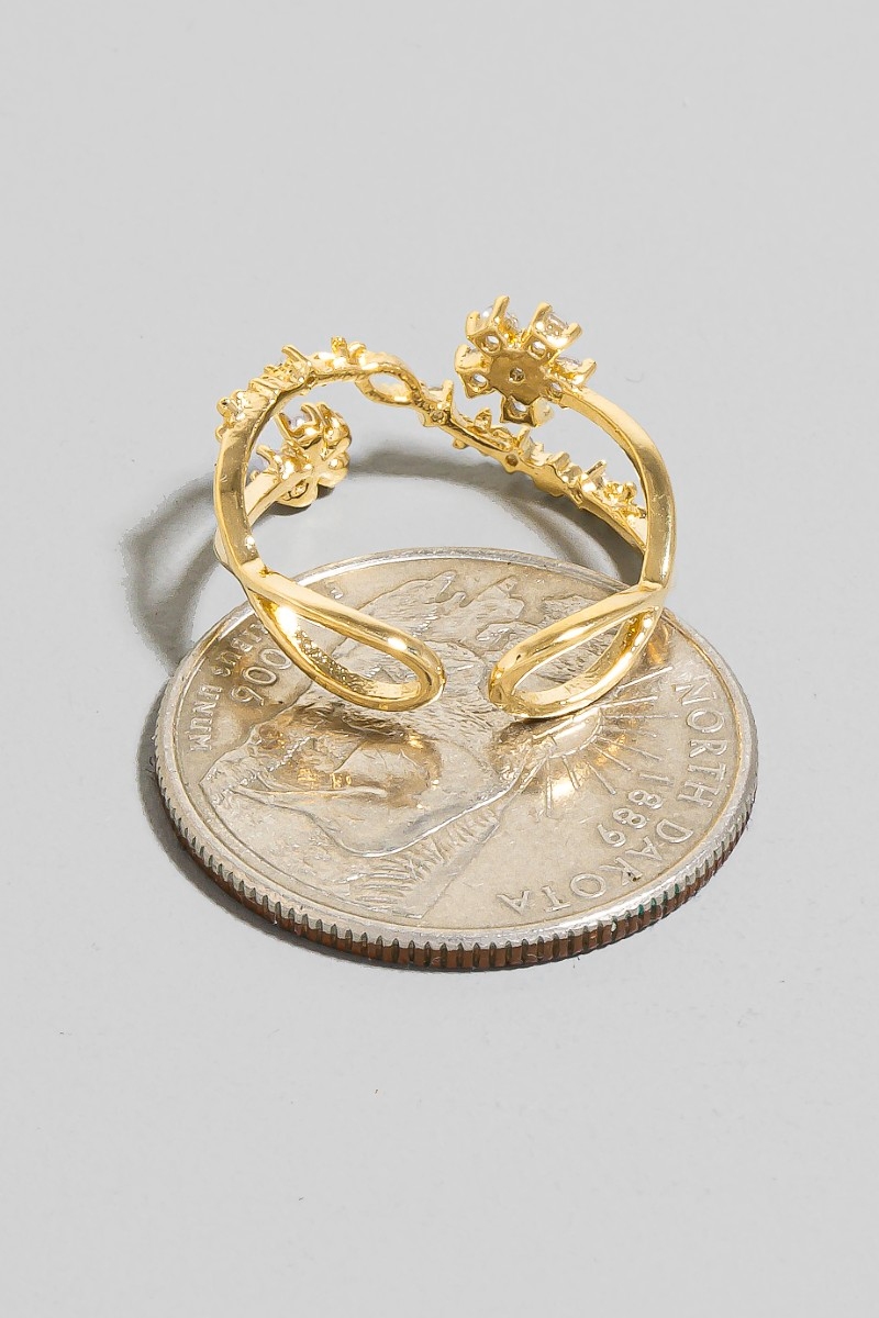 • This ring introduces a unique layered double cubic zirconia flower open band style. Celebrate individuality with this ring that effortlessly expresses your unique sense of style.