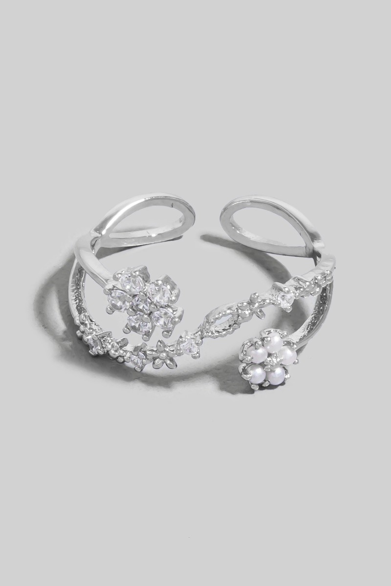 • This ring introduces a unique layered double cubic zirconia flower open band style. Celebrate individuality with this ring that effortlessly expresses your unique sense of style.