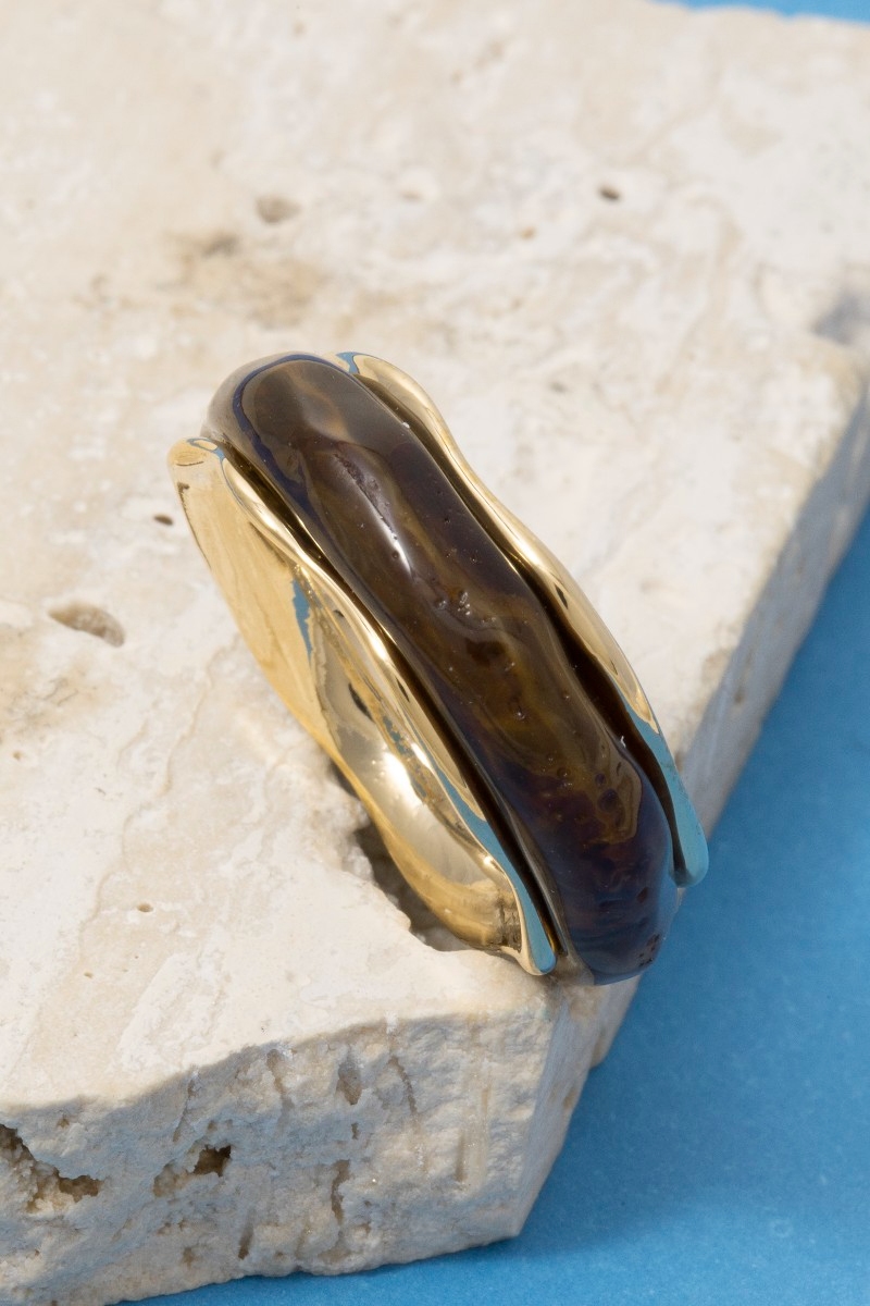 - This ring showcases a unique metallic lined warped shape amber acrylic band style. Witness the perfect fusion of style and functionality as this ring effortlessly complements your lifestyle.