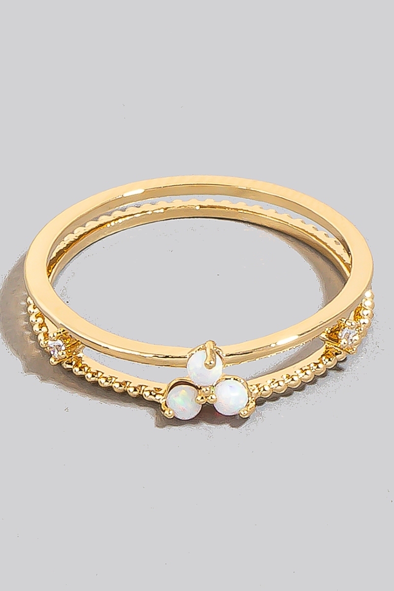 • This ring showcases a timeless mini triple opal studded layered band style. Unveil modern elegance with this subtly intricate ring.