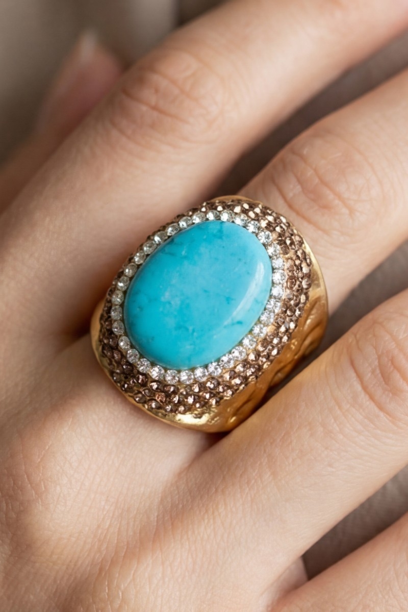 - This ring introduces a stunning oval turquoise stone pave statement style. Discover the perfect balance of functionality and fashion.
