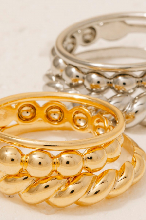 • This ring set displays a fashionable 3pc mixed textured band rings set style. Celebrate the art of accessorizing with this piece that effortlessly encapsulates modern trends.