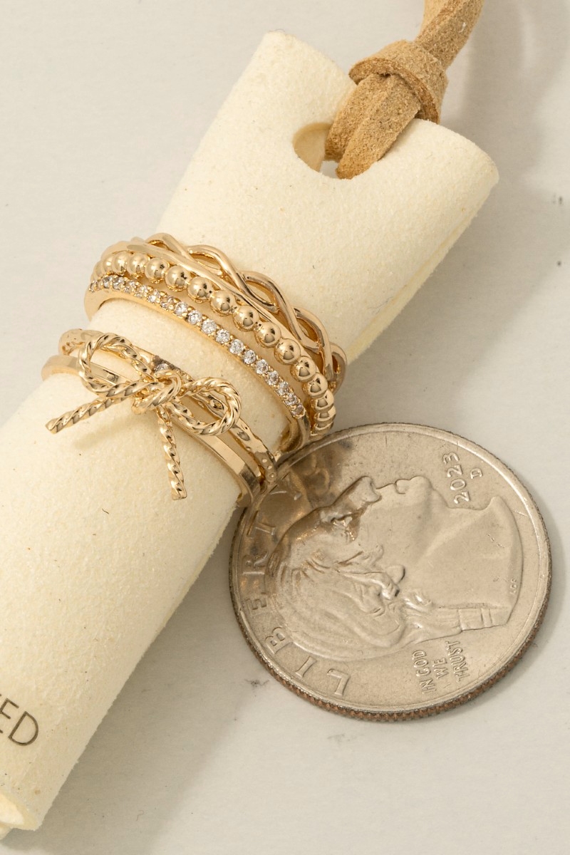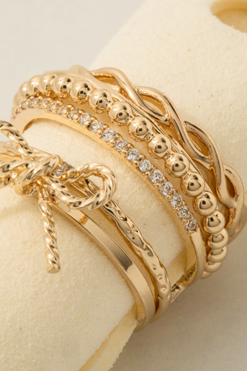 • This ring set introduces a stunning 5pc cubic zirconia mixed bow and chain style band rings style. Discover the perfect balance of functionality and fashion.