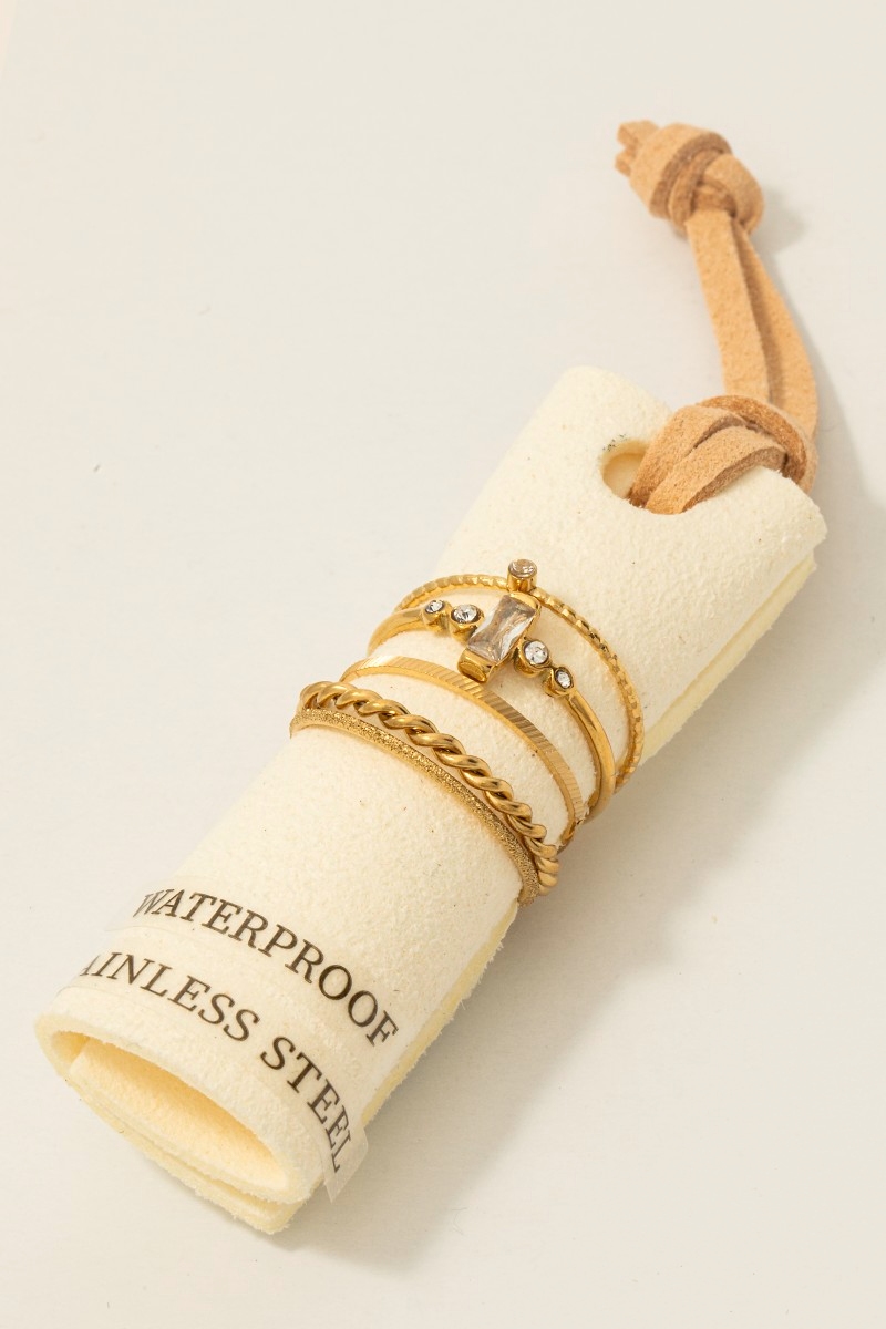- This ring set showcases a timeless baguette stone 5pc stainless steel band rings set style. Experience a subtle blend of modernity and classic charm as this ring set effortlessly adorns your ensemble.