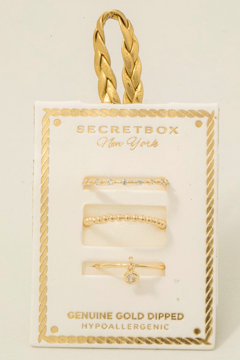 - This ring set showcases a unique secret box gold dipped 3pc dainty band rings set style. Indulge in the artistry of accessorizing with this unique piece.
