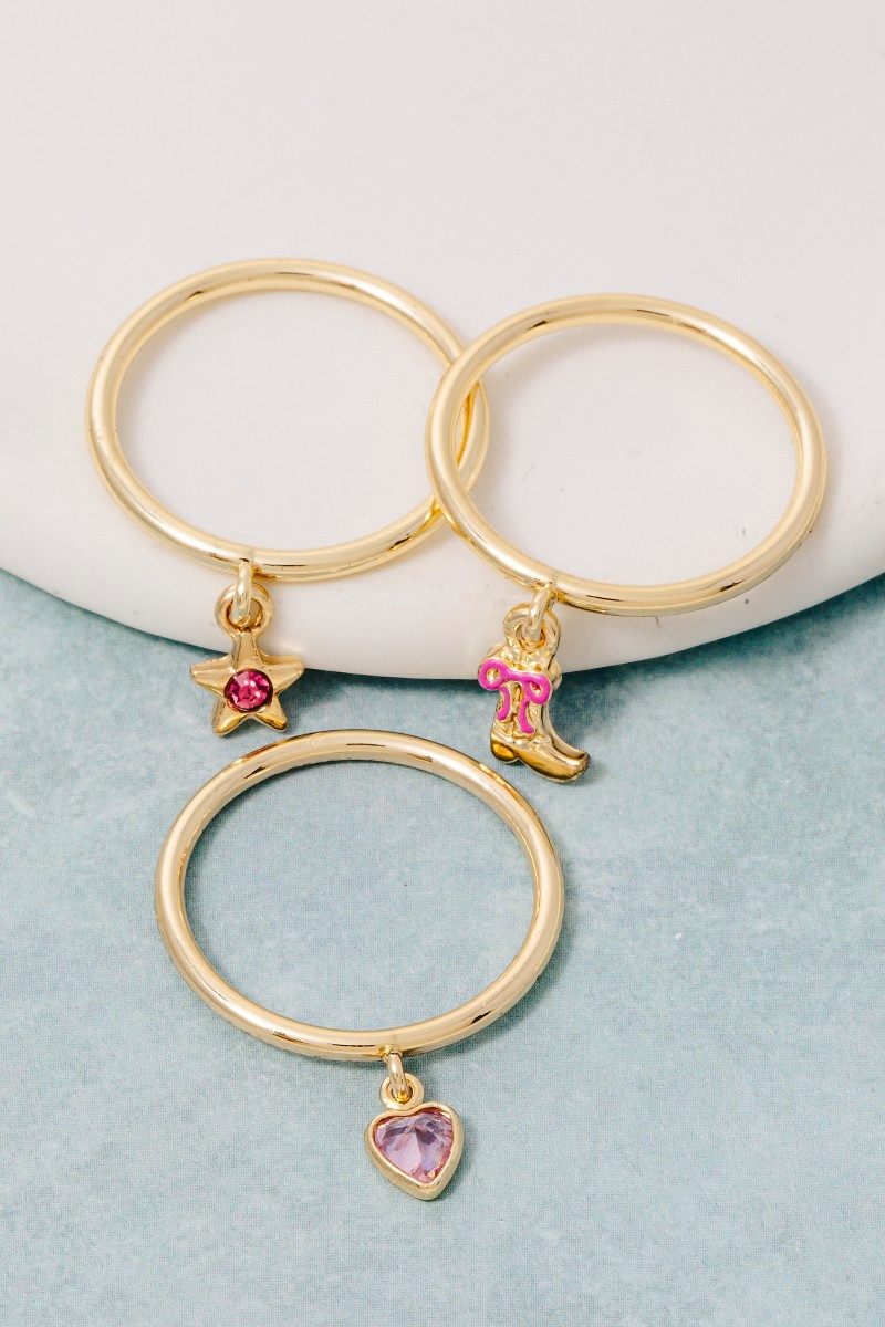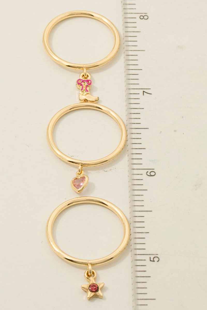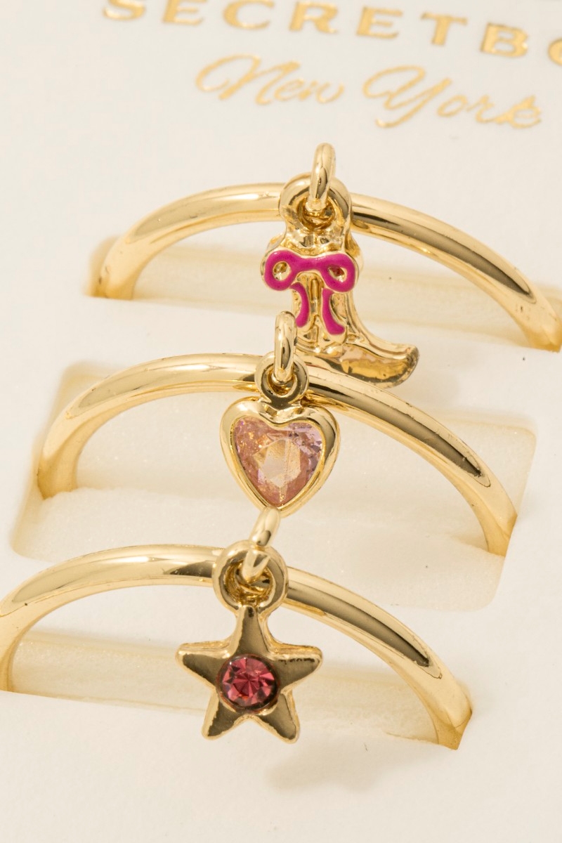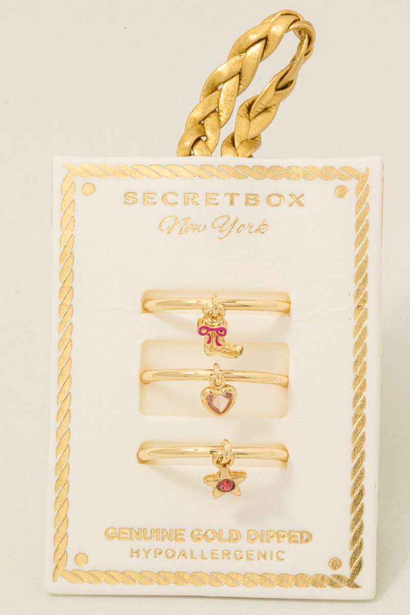 - This ring set displays a vibrant secret box gold dipped 3pc dangle charms band rings set style. Immerse yourself in the details of design, as this ring set effortlessly becomes a conversation starter.