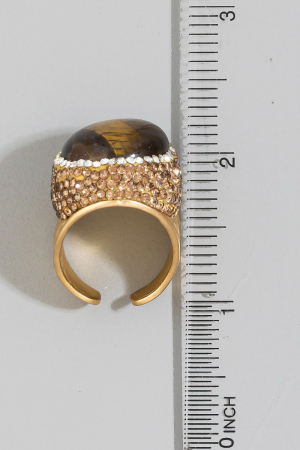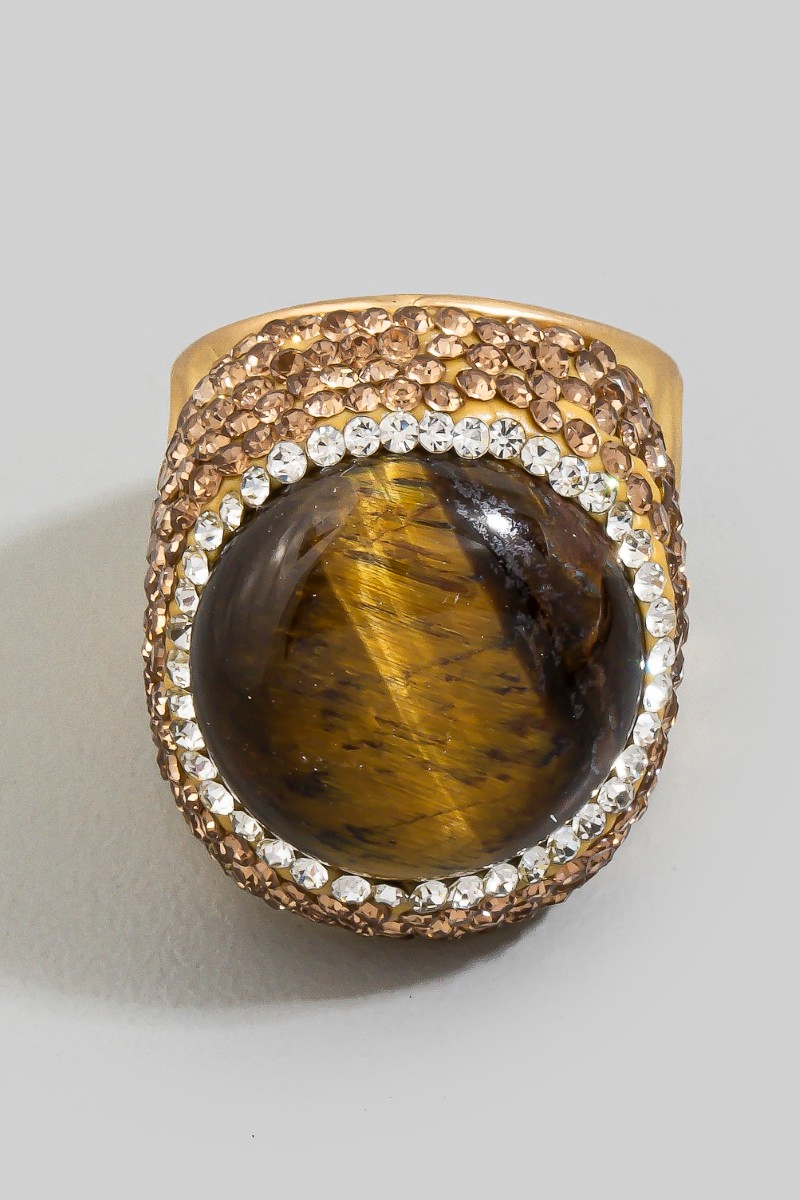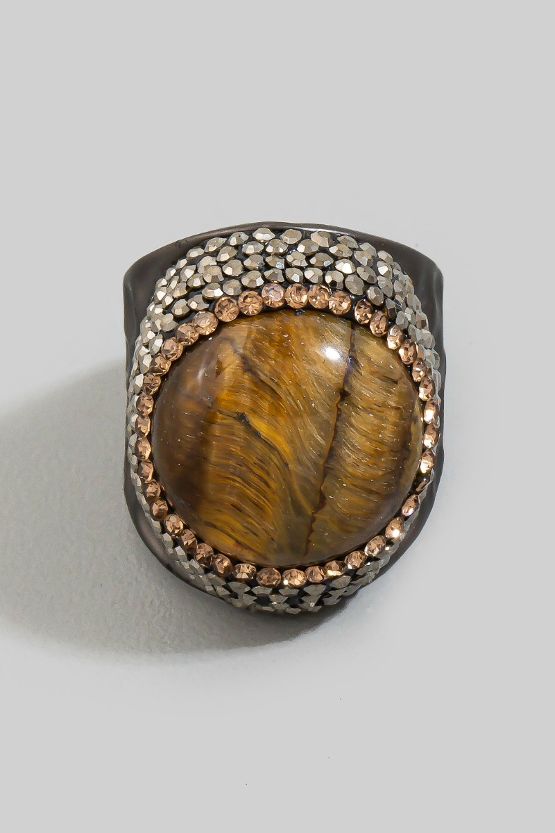 • This ring showcases a unique round pave tiger eye stone statement style. Embark on a journey of sartorial refinement as this ring effortlessly complements your fashion sense.