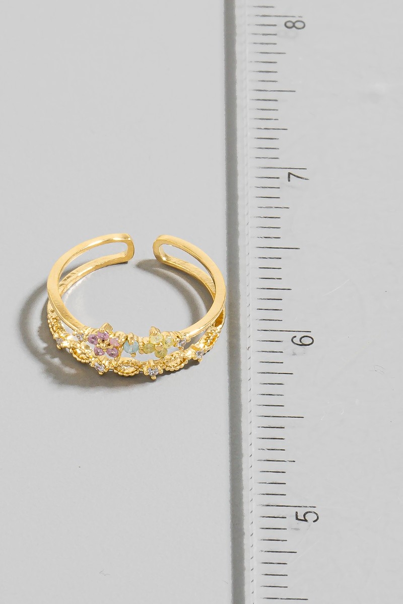 - This ring brings a luxurious two row cubic zirconia flower gold dipped style. Witness the perfect fusion of style and functionality as this ring effortlessly complements your lifestyle.