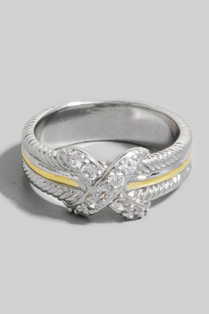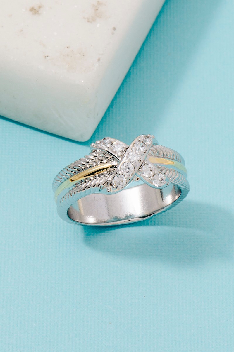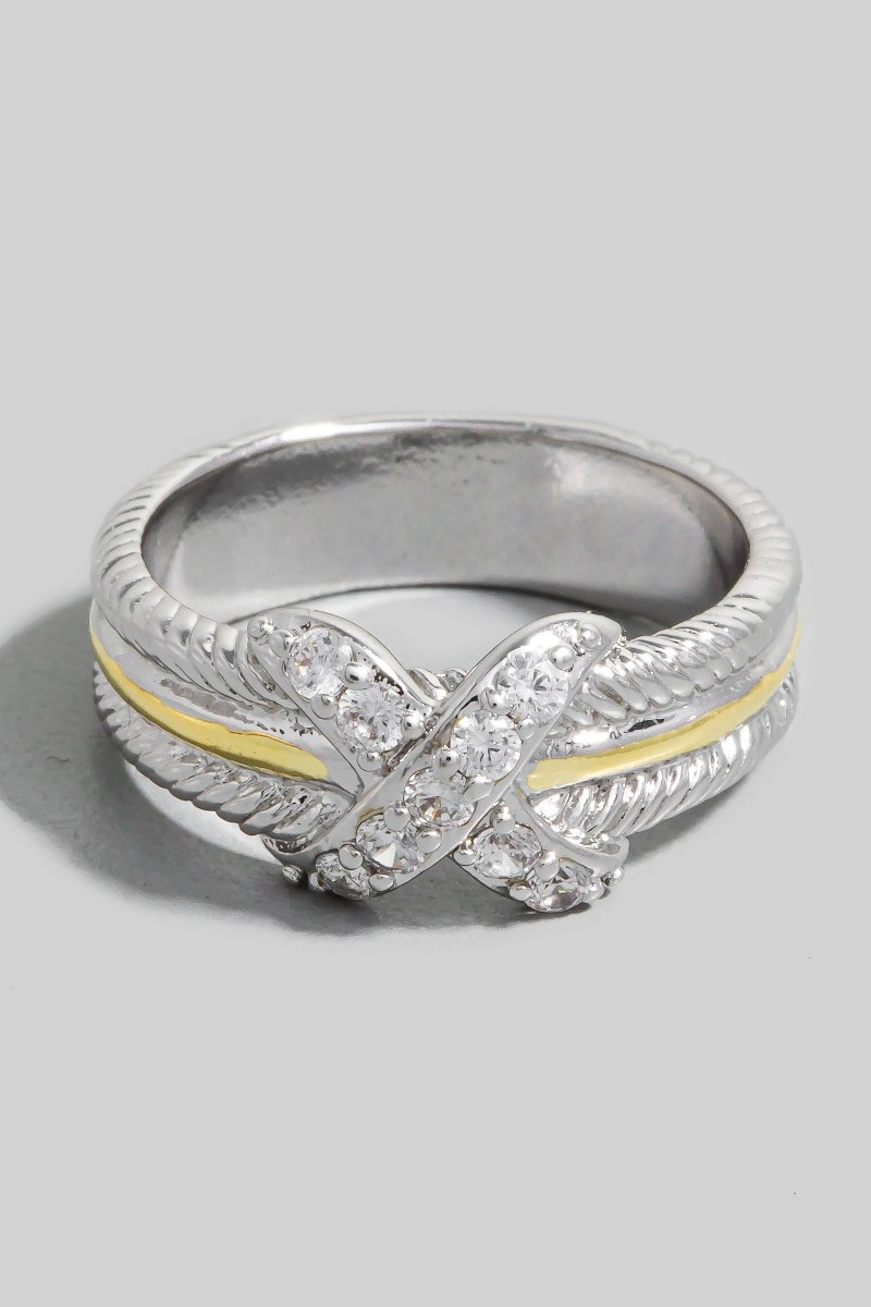 • This ring showcases a timeless two tone cubic zirconia pave x band style. Step into a world of refined taste as this ring effortlessly refines the details of your outfit.