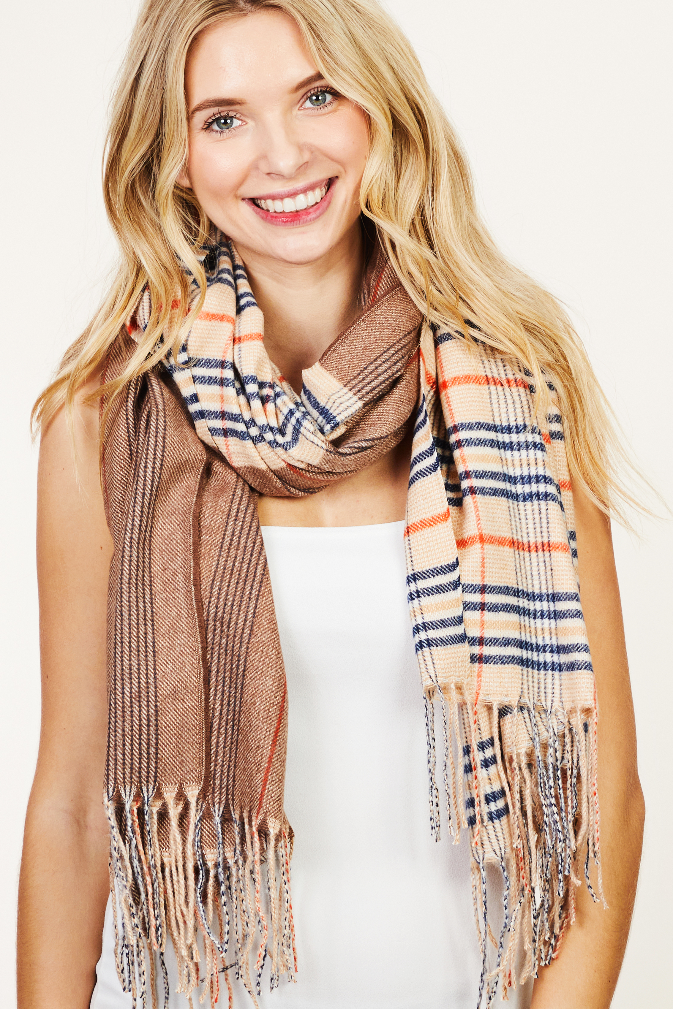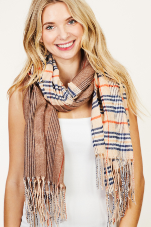 - This oblong scarf brings a luxurious double pattern plaid striped style. Witness the perfect fusion of style and functionality as this oblong scarf effortlessly complements your lifestyle.