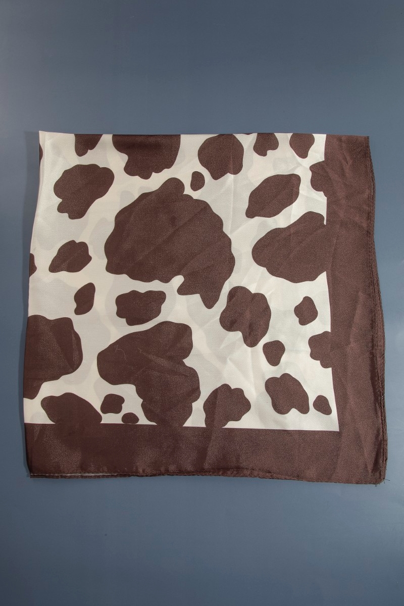 - This scarf introduces a unique dark brown cow print square bandana style. Elevate your ensemble with this scarf that effortlessly captures the essence of refined fashion.