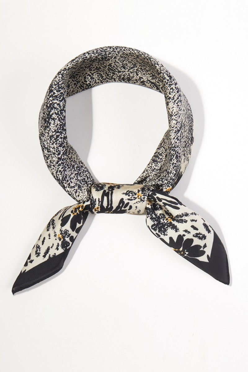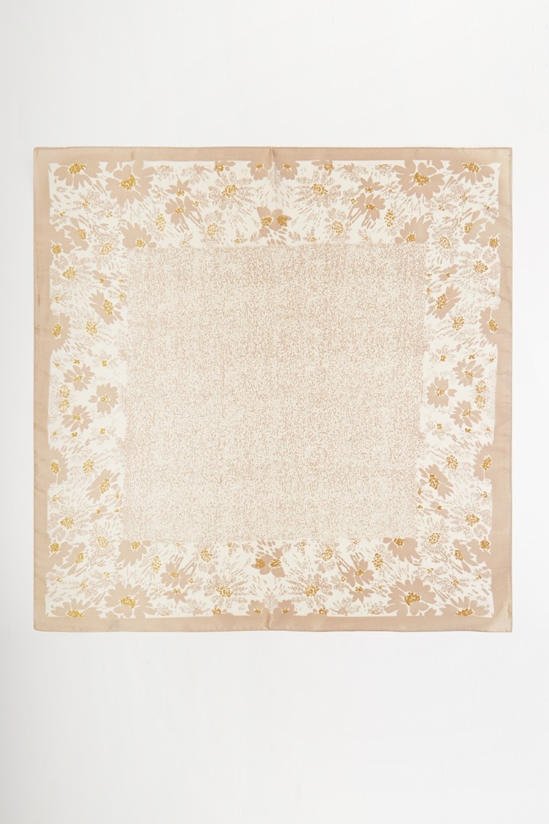 - This scarf showcases a timeless floral border print bandana style. Witness the perfect fusion of style and functionality as this scarf effortlessly complements your lifestyle.