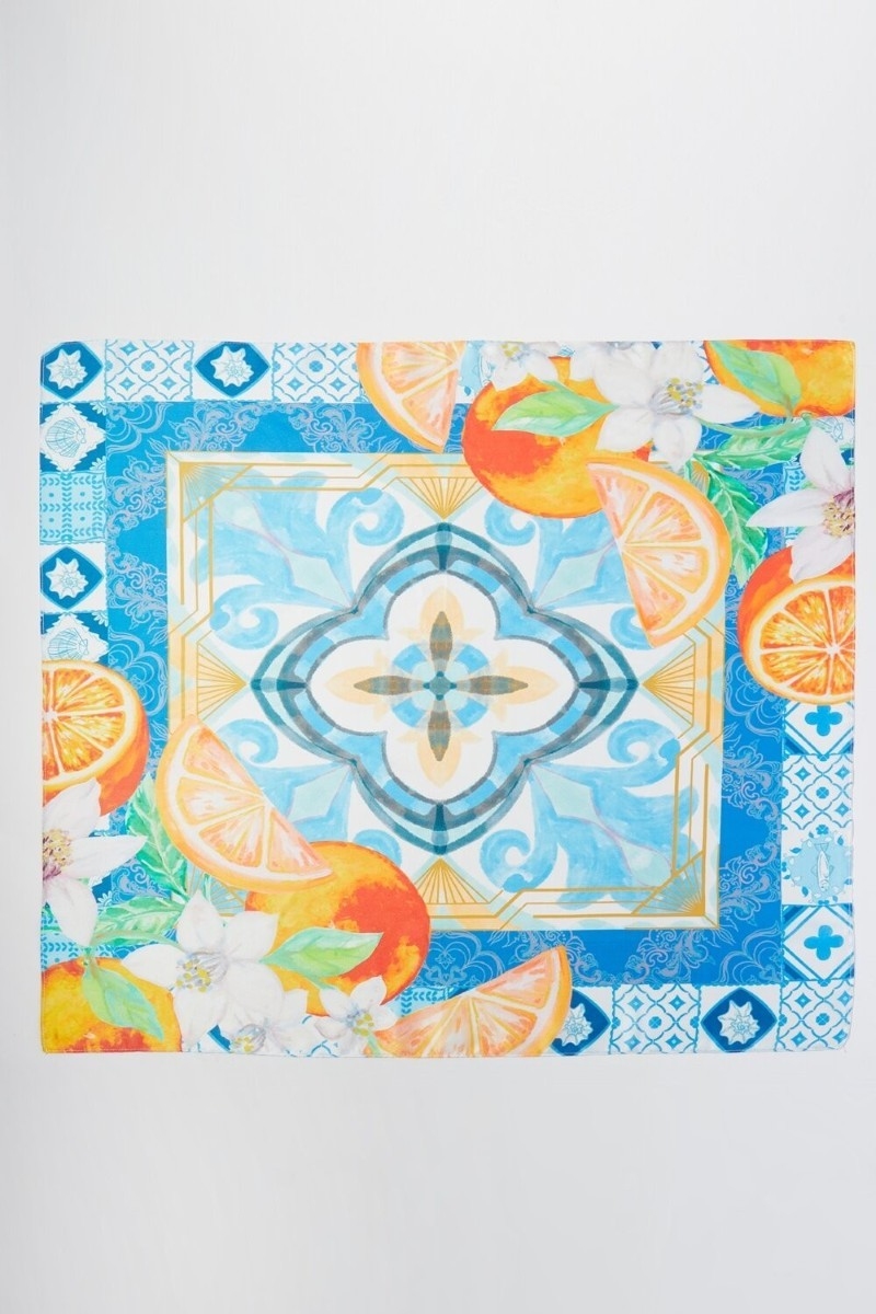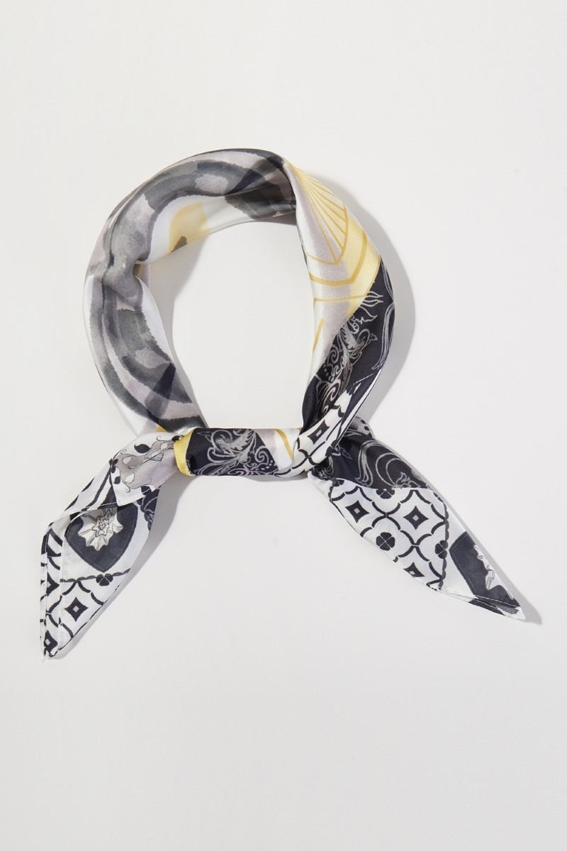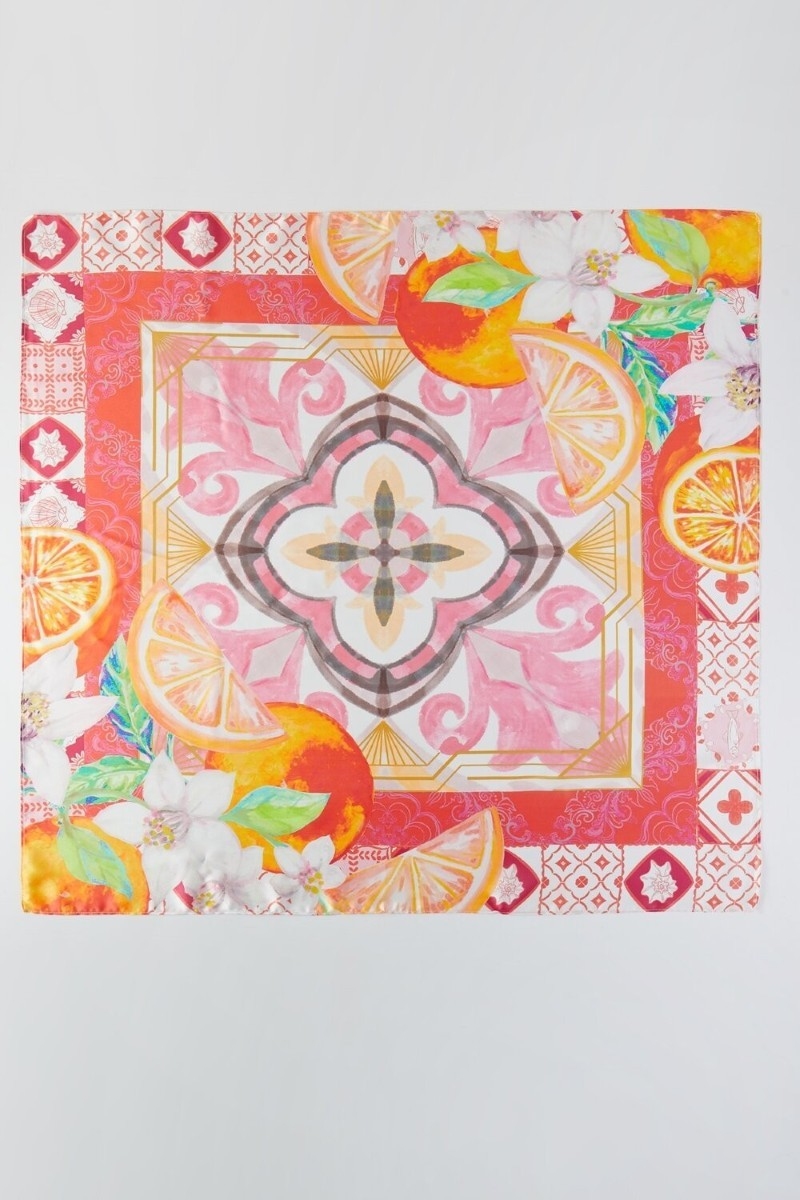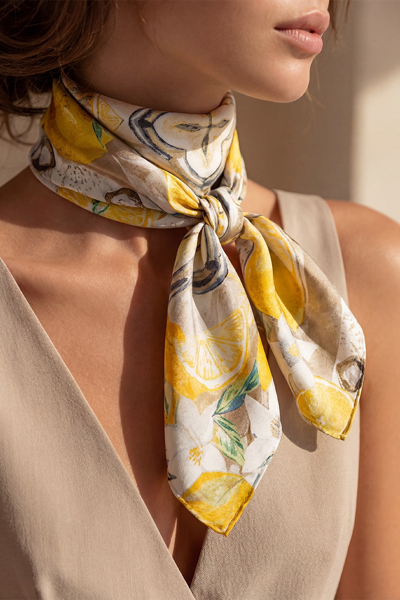 - This scarf showcases a timeless flower and lemons print square bandana style. Unveil a new dimension of sophistication as this scarf effortlessly enhances the elegance of your ensemble.