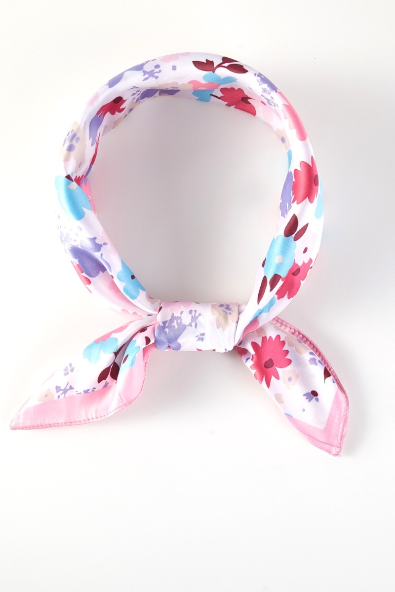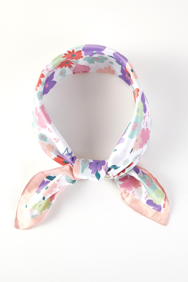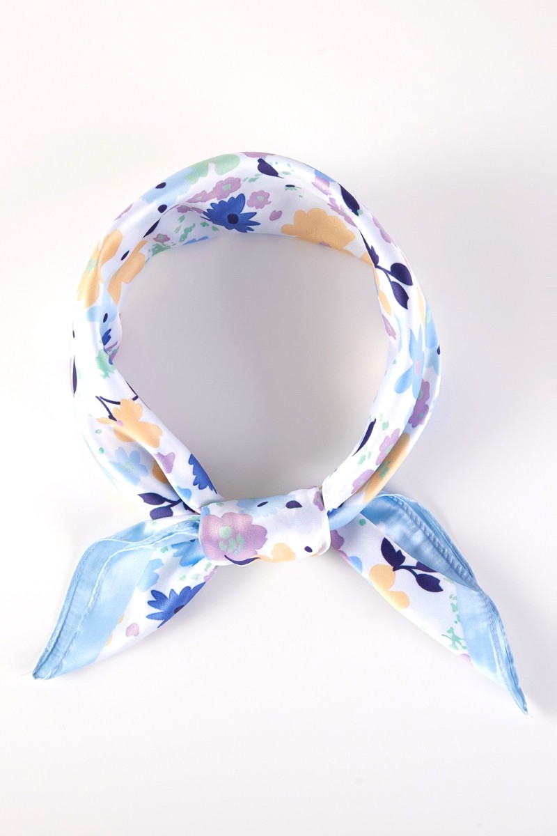 - This scarf showcases a timeless mini flower print square bandana style. Celebrate the art of accessorizing with this piece that effortlessly encapsulates modern trends.