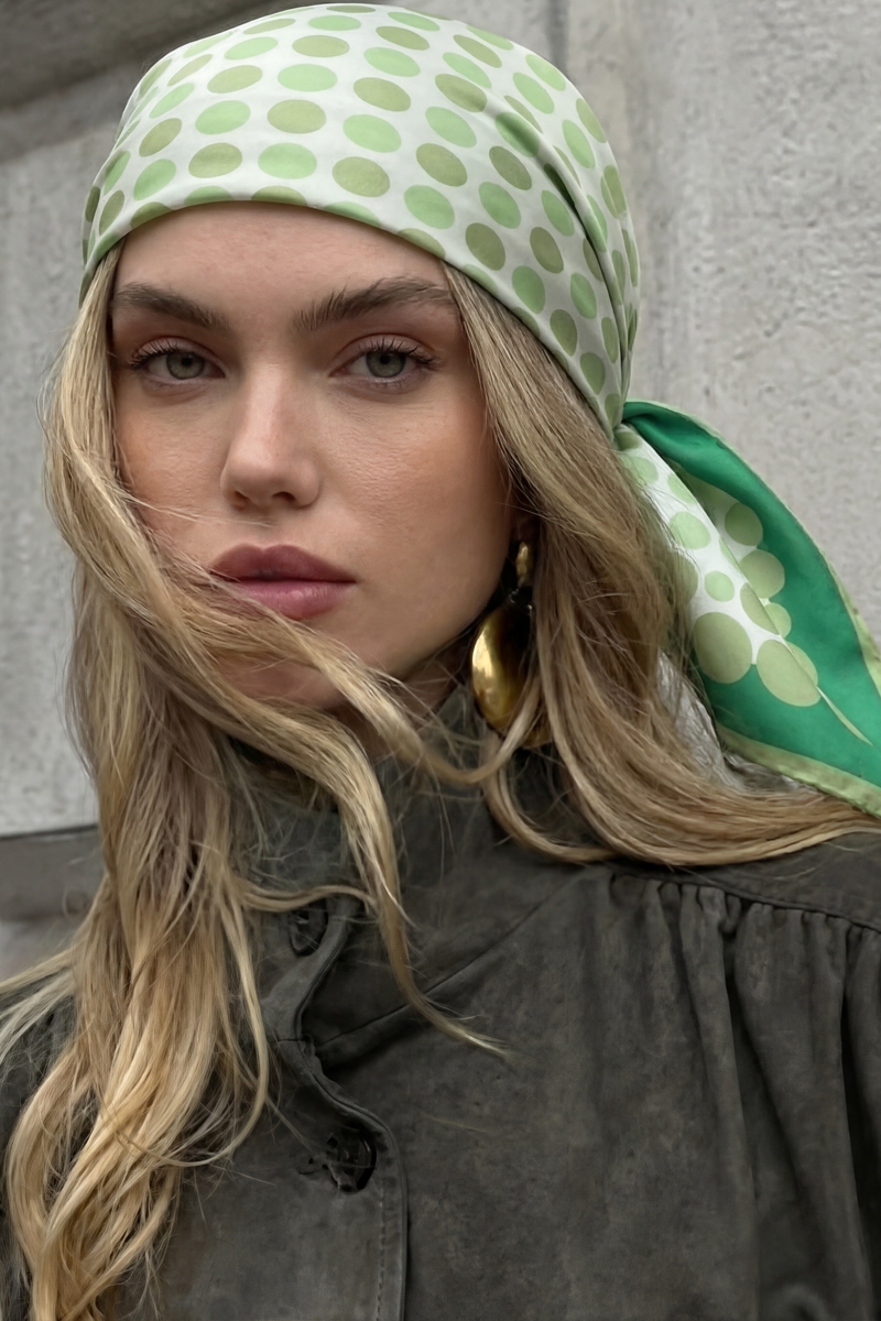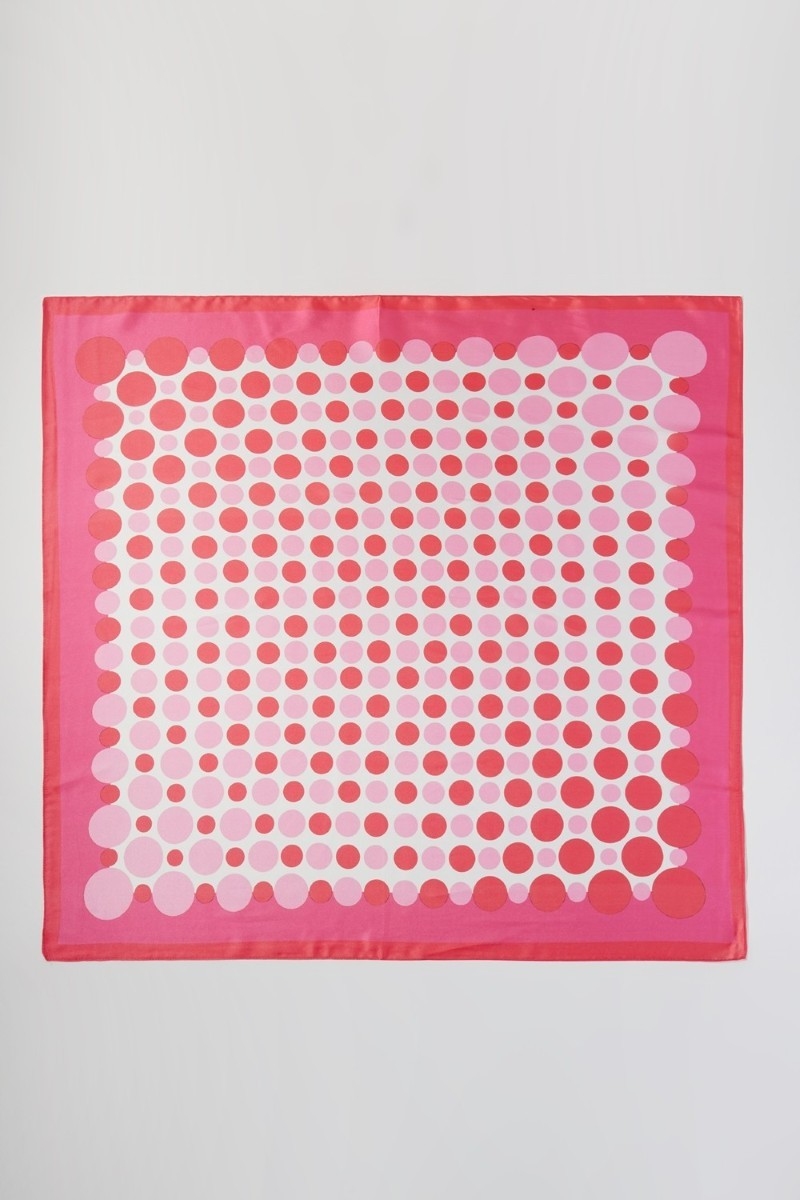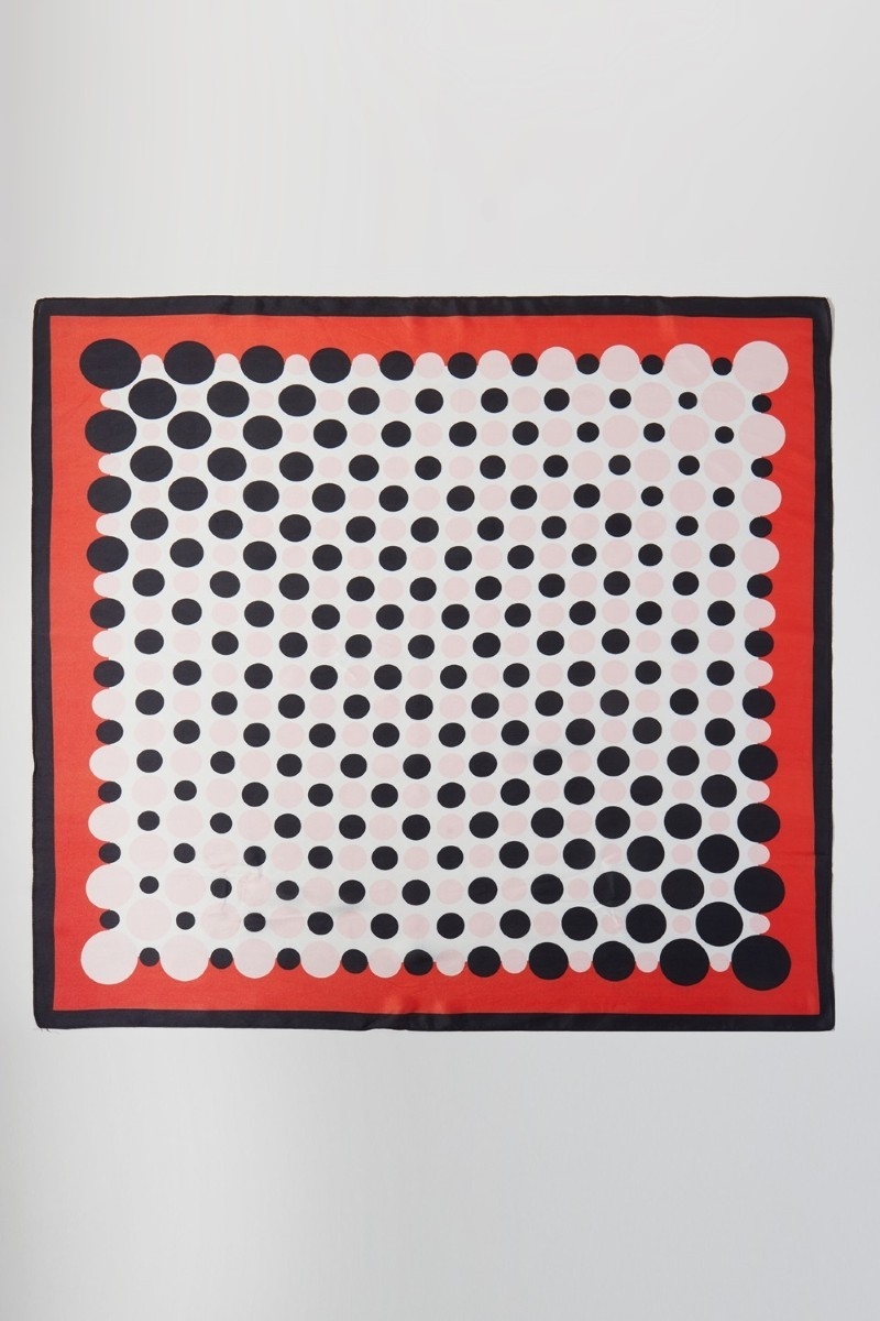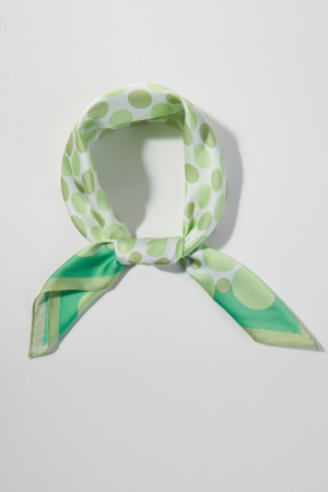 - This scarf brings a stunning multi color polka dot print square bandana style. Experience a subtle blend of modernity and classic charm as this scarf effortlessly adorns your ensemble.