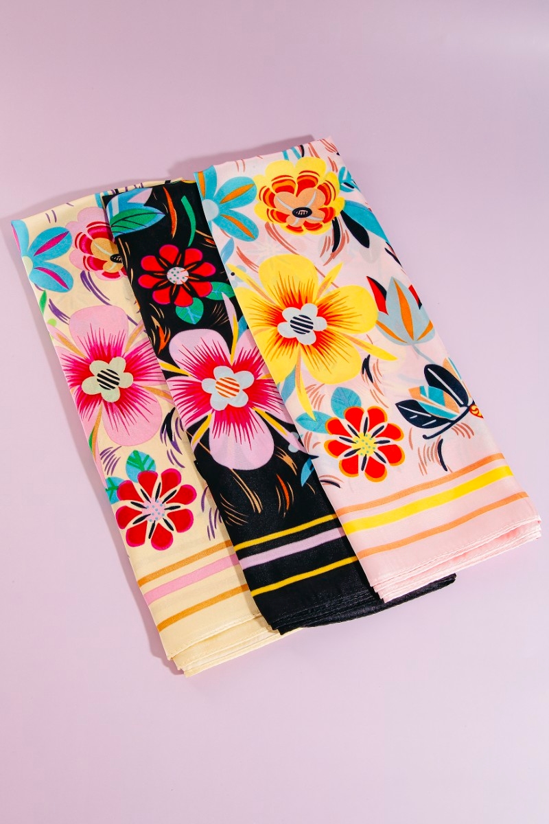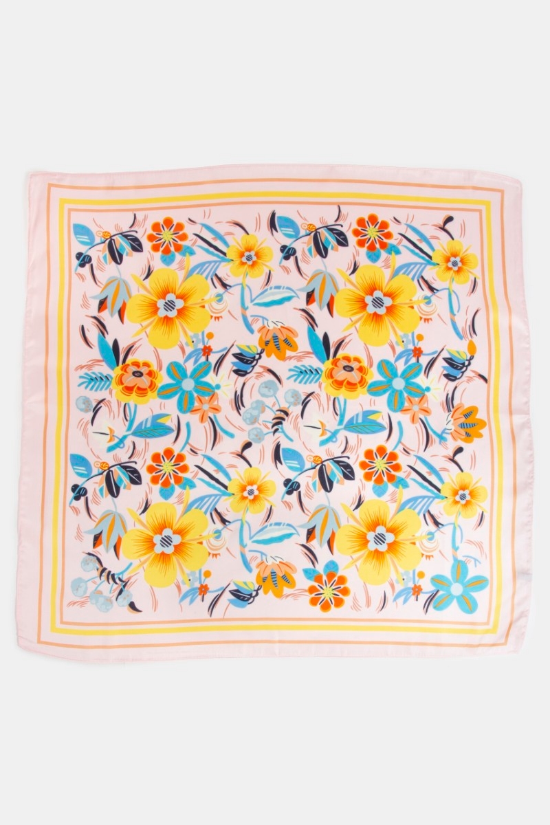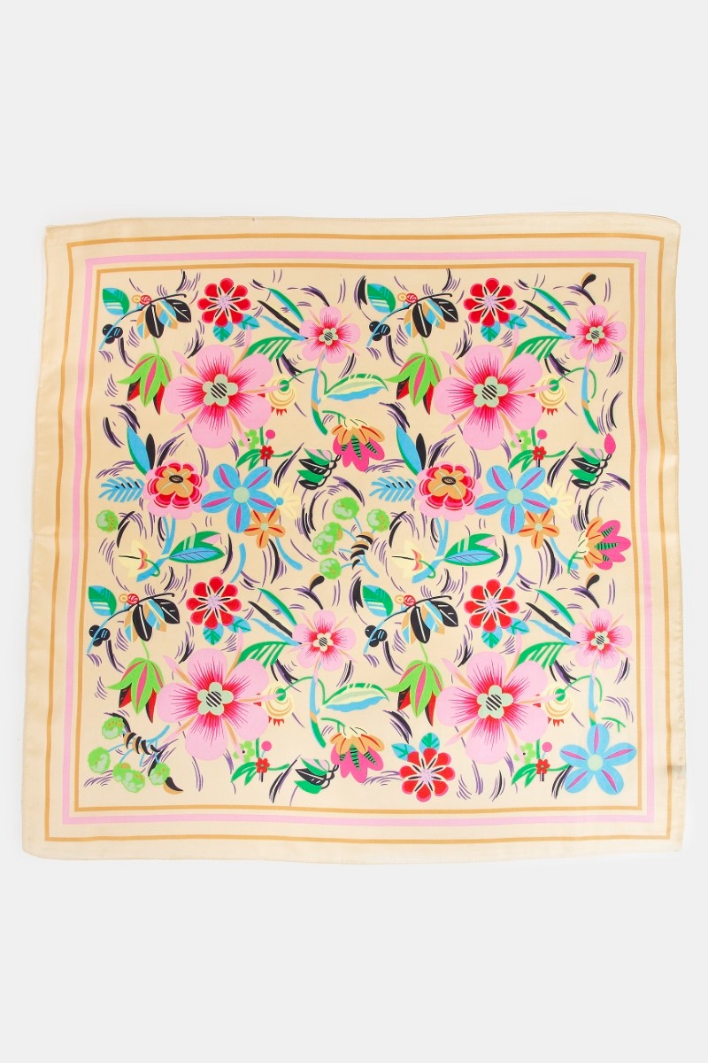 • This scarf displays a fashionable multi flower pattern square style. Delight in the nuanced details that make this scarf a testament to fine design and impeccable taste.