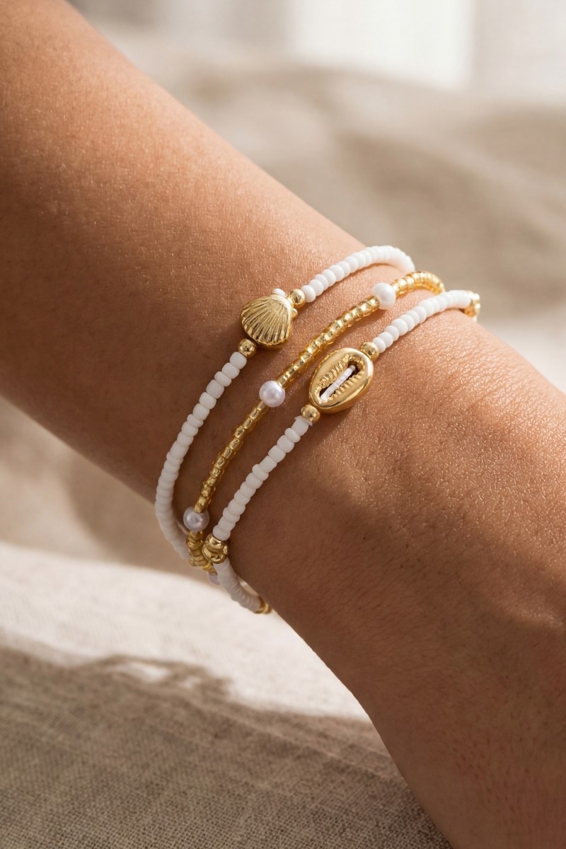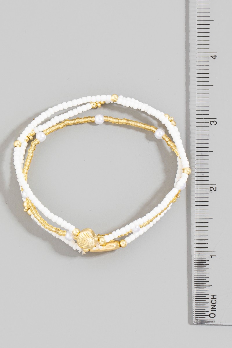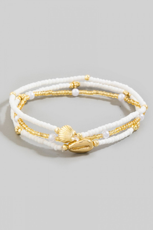 - This bracelet features a fashionable cowrie and clam shell mixed beaded set style. Savor the craftsmanship that goes beyond the ordinary, as this bracelet effortlessly captivates attention.