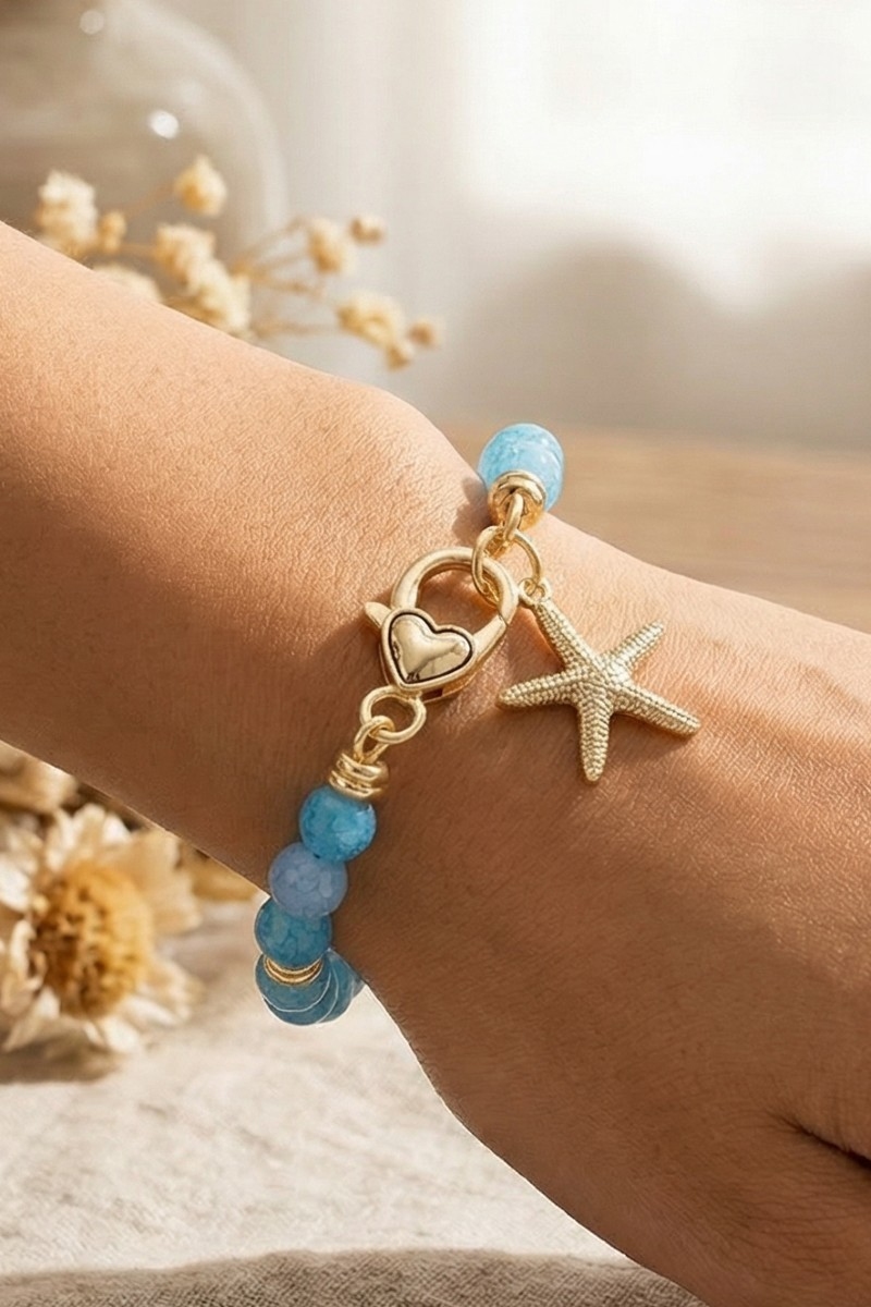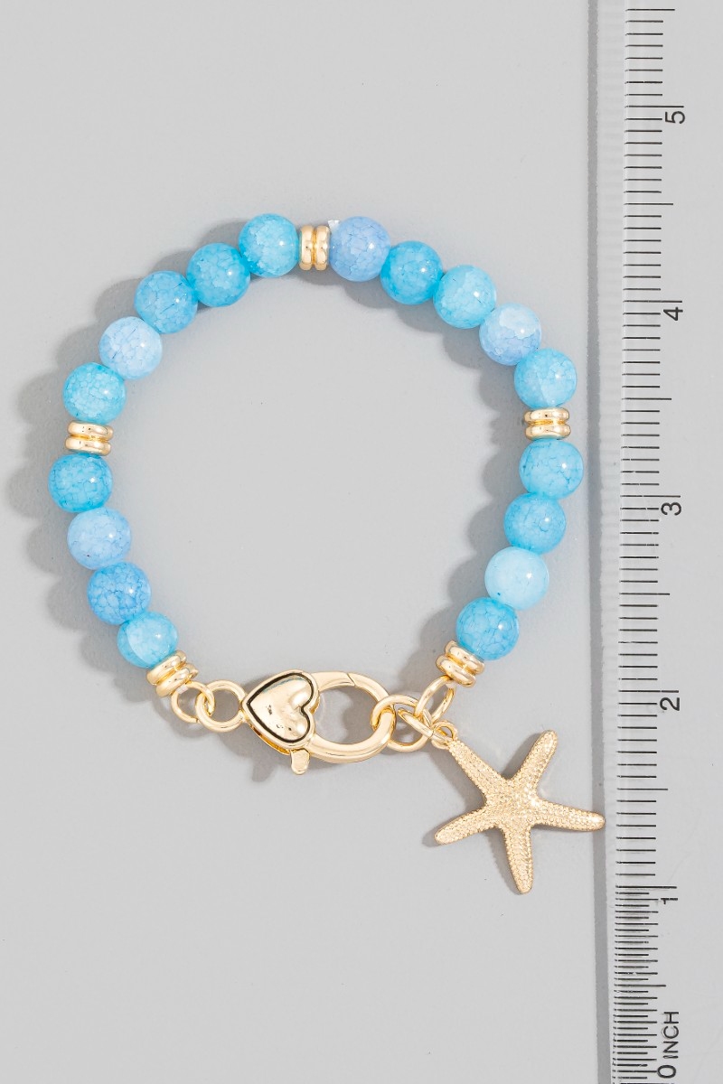 • This bracelet introduces a stunning starfish charm and heart clasp glass beaded style. Elevate your ensemble with this bracelet that effortlessly captures the essence of refined fashion.